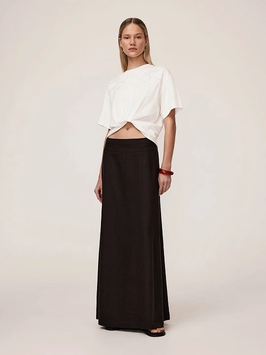 Футболка выполнена в стиле "романтический кэжуал". Флоральная вышивка, являющаяся лейтмотивом капсульной коллекции, и свободный крой добавляют образу женственности и утонченности. Лаконичный дизайн и хлопковый трикотаж делают блузу универсальной. Футболка выполнена из высококачественного хлопкового трикотажа, прошедшего мерсеризацию. Это процесс обработки хлопка, который делает его более прочным, гладким и блестящим. Ткань становится устойчивой к износу, меньше мнется и лучше сохраняет цвет. Мерсеризованный хлопок приятен на ощупь, обеспечивает комфорт и воздухопроницаемость. Базовый белый - универсальный цвет, который легко сочетается с другими оттенками, что делает футболку незаменимым элементом гардероба. Симметричная вышивка на груди, выполненная на собственном производстве с помощью японского оборудования Tajima, добавляет элемент дизайна, делая блузу более интересной и стильной, особенно потому, что рисунок вышивки повторяет цветочные мотивы основного принта капсульной коллекции. Круглый вырез создает аккуратный и сбалансированный силуэт, подчеркивая зону декольте и не перегружая модель с достаточно активным декором.