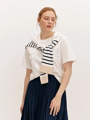 Базовая футболка станет отличным дополнением к вашему гардеробу. Она выполнена в фирменном оттенке “оптический белый” и имеет лаконичный дизайнерский принт на груди. Хлопковый материал приятно ощущается на теле и долго сохраняет безупречный вид. Модель прямого силуэта с коротким втачным рукавом и круглой горловиной обработанной бейкой. Минималистичный принт позволяет легко сочетать футболку с брюками и джинсами, создавая разнообразные образы.