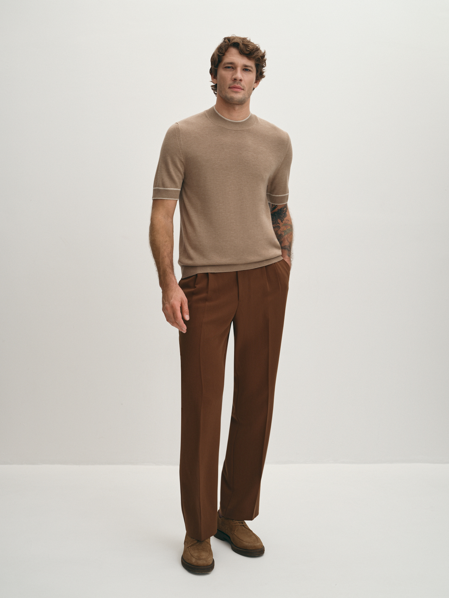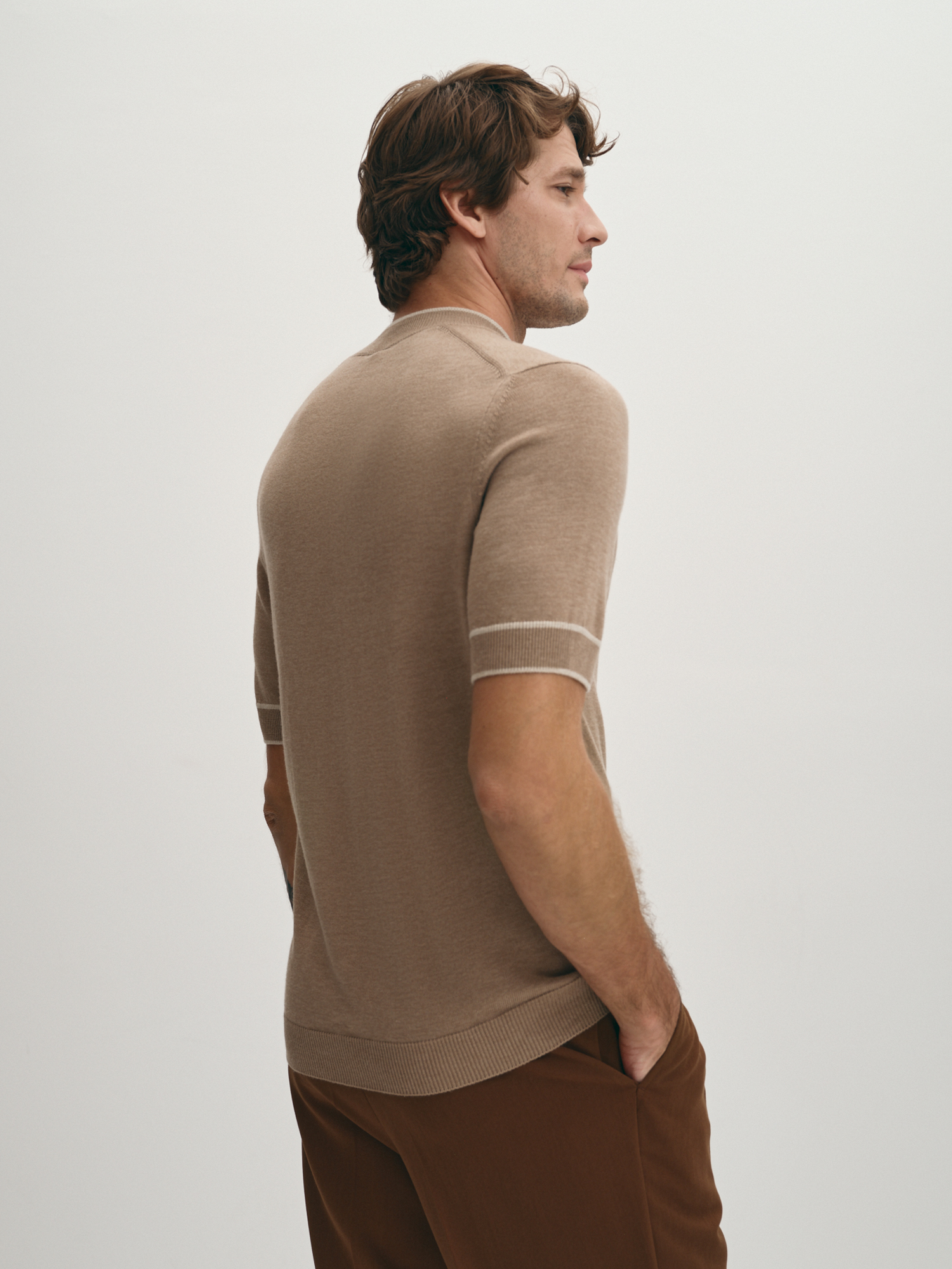 Вязаная футболка темно-бежевого оттенка поможет разбавить ваш повседневный образ. В составе присутствуют шерсть мериноса и кашемир, которые делают ткань очень приятной к телу. Благодаря контрастным элементам на рукавах, футболка отлично комбинируется с синими джинсами, спортивными брюками и чиносами.