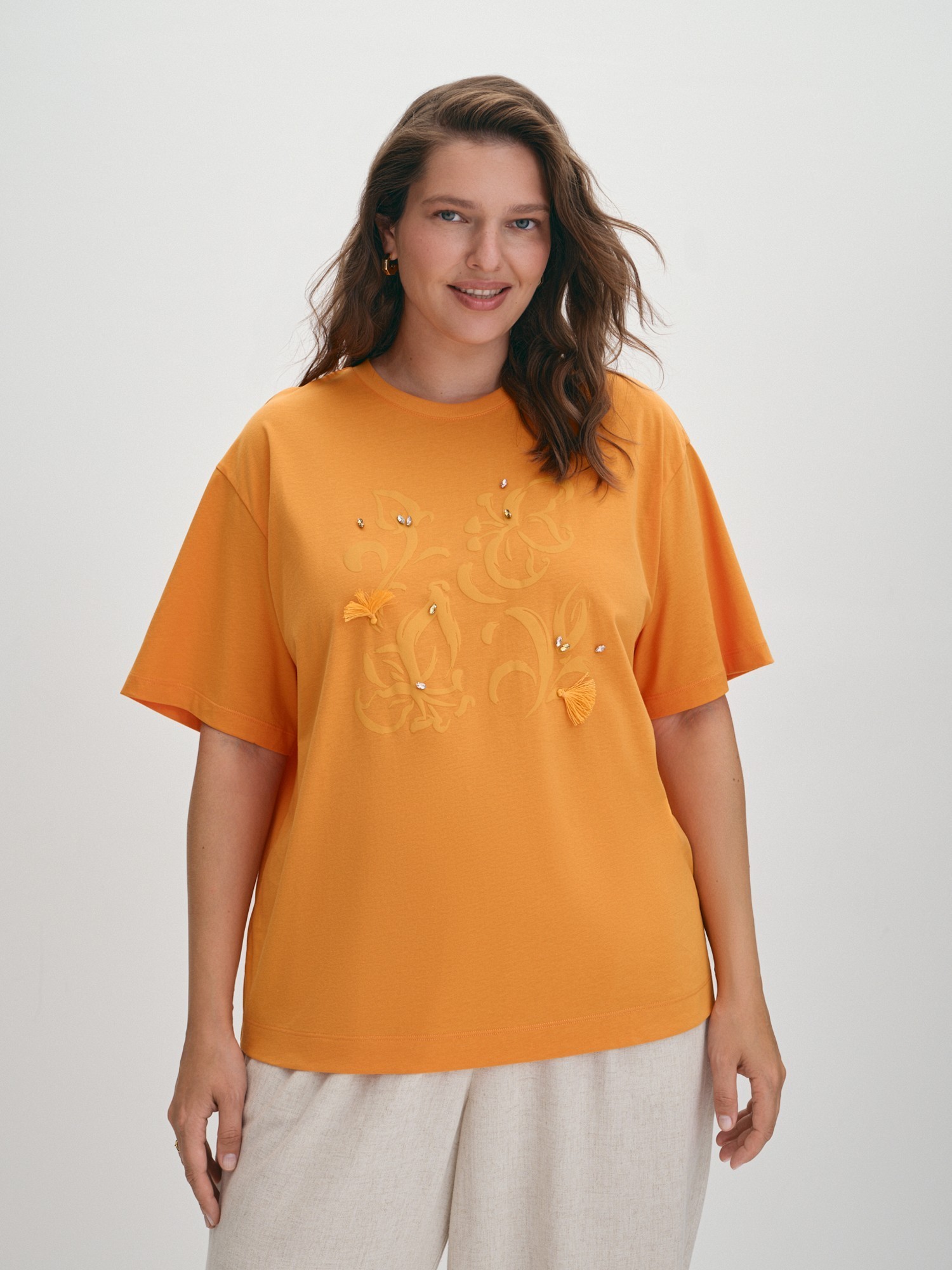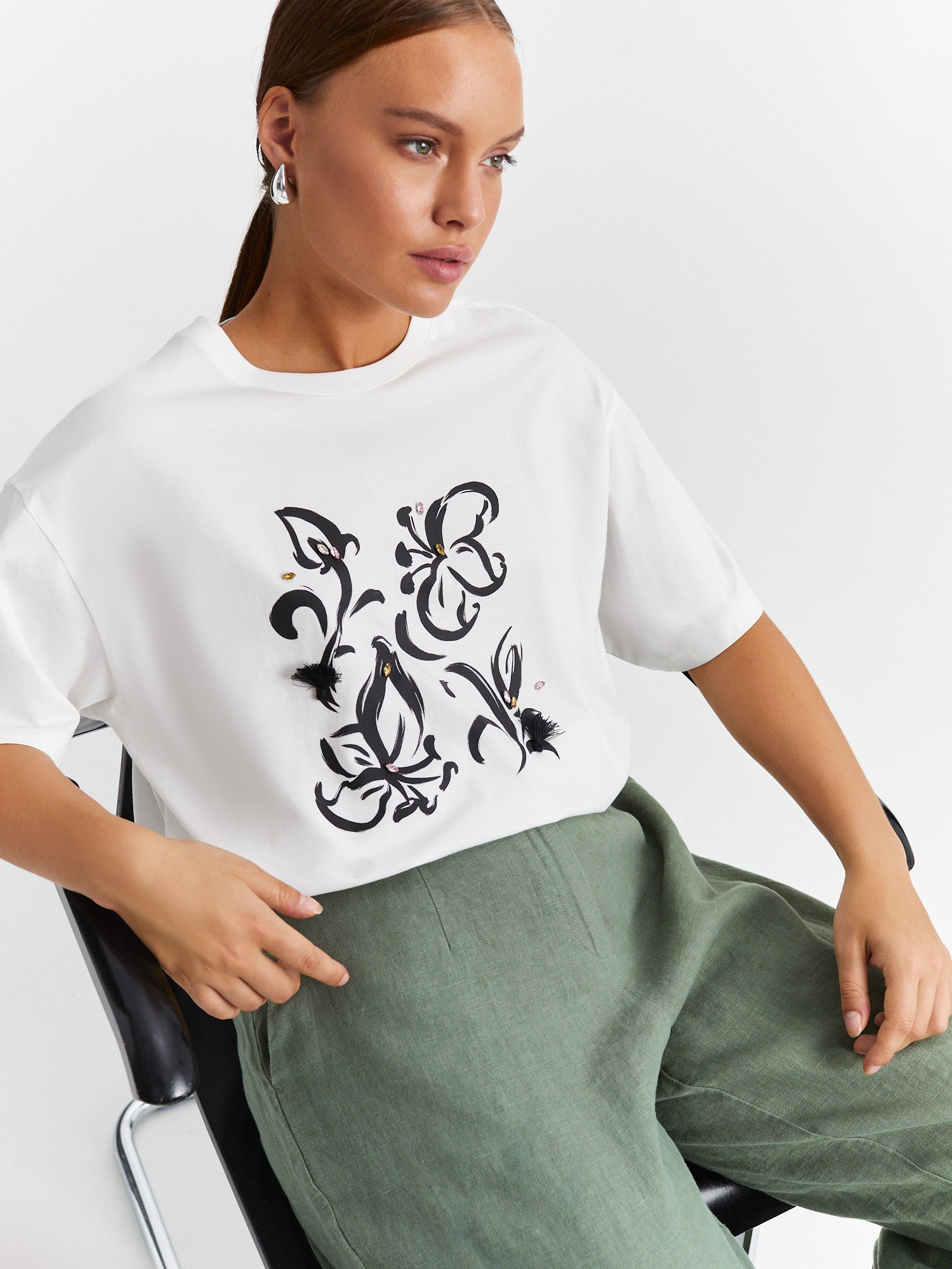 Универсальная базовая футболка из дышащего 100% хлопка с авторским рисунком. Модель выполнена в стилистике «ручной» росписи и декорирована нашивными стразами и текстильными кисточками. Модель свободного силуэта со спущенной линией плеча и круглой горловиной. Свободный крой обеспечивает комфортную посадку на любой тип фигуры и позволяет носить футболку как самостоятельно, так и как нижний слой под пиджак, комбинируя ее с брюками или джинсами.