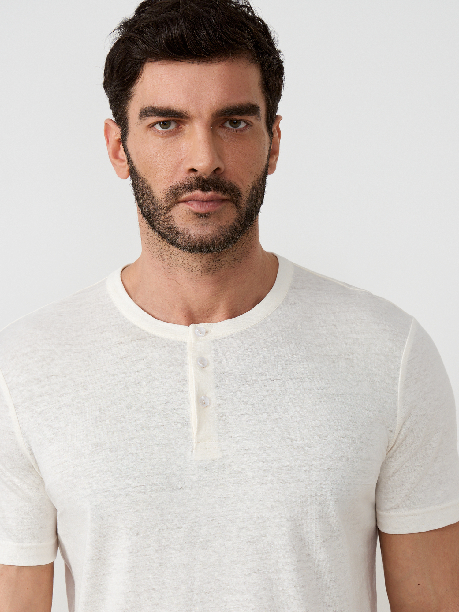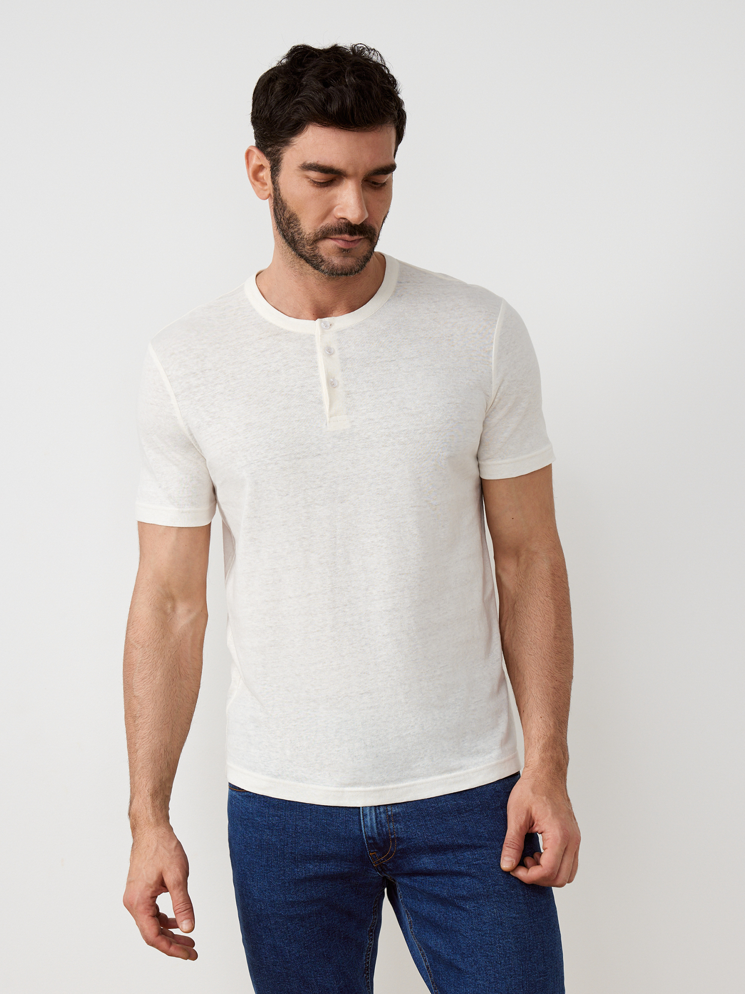Лаконичная футболка белого оттенка выпололнено из трикотажного полотна премиального качества. Плотный материал на основе хлопка слегка тянется, обеспечивая удобную посадку. Модель прямого силуэта, с воротником стойкой, коротким втачным рукавом и центральной застёжкой-планкой на три пуговицы. Футболка в стиле кэжуал отлично впишется в базовый гардероб, образ можно дополнить джинсами, лёгкими брюками или шортами.