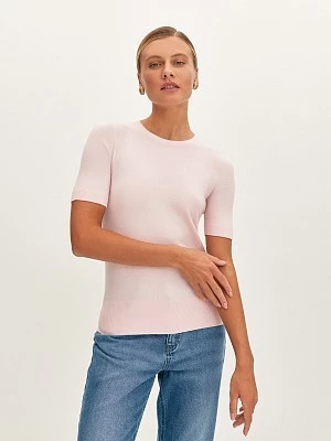 Цельновязанную футболку изготовили из шелковистой пряжи на основе вискозы. Базовая модель с коротким рукавом и круглой горловиной подойдет как для делового, так и для повседневного образа. Полуприлегающий силуэт и широкая резинка по низу изделия обеспечивают комфортную посадку по фигуре, а нижний край декорировали металлическим украшением.Лёгкая вязаная футболка дополнит образ стиле смарт - кэжуал.