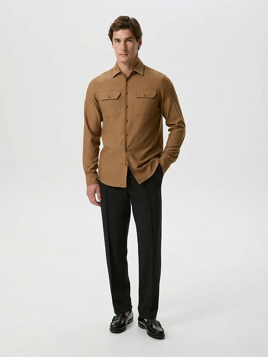 Однотонная светло-коричневая рубашка выполнена изсмесовой ткани с высоким содержание хлопка и вискозы. Модель комфортного силуэта regular fit, с длинным рукавом, лаконичного кроя: отложной воротник на отрезной стойке, центральная застежка на пуговицы, закругленный низ. Узкая кокетка на спине выполнена для лучшей посадки. Нагрудные накладные карманы с клапанами делают рубашку похожей на куртку или шакет. Модель декорирована ,брендированной вышивкой на манжете, выполненной на японской машине Tajima на собственном производстве полного цикла. Хлопок гипоаллергенен, хорошо дышит, удобен в эксплуатации. Вискоза тактильно приятна. Сорочка будет востребована как неформальная офисная, повседневная. Наши дизайнеры рекомендуют носить ее в паре с футболкой или водолазкой, чтобы создать модную многослойность.