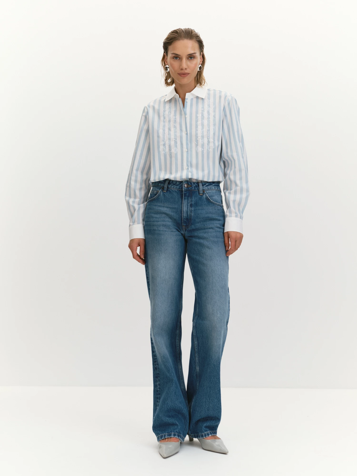 Блузка лаконичного прямого кроя в бело-голубую полоску. Привлекает внимание вышивка по дизайнерскому эскизу. Сочетание нюансных элементов, выполненных пунктиром, и объемных деталей, формирует 3D-эффект. Декор выполнен с помощью современного оборудования фирмы TAJIMA. Блуза выполнена из натурального волокна, на 100% состоящего из хлопка. Одежда из хлопка, в процессе грамотной эксплуатации, сохраняет свой внешний вид надолго, она гигиенична и гипоаллергенна. Рубашка в бледно-голубую полоску (Whispy Blue) универсальна в сочетаниях. Выбор наших стилистов - образ с вареными джинсами DJ0173XY1 и джемпером ровной вязки JM0189V.