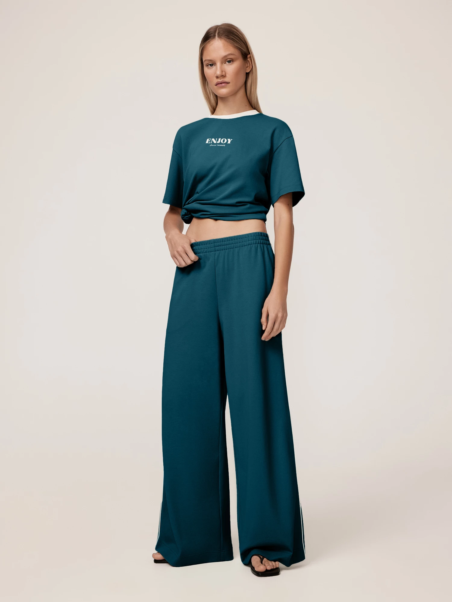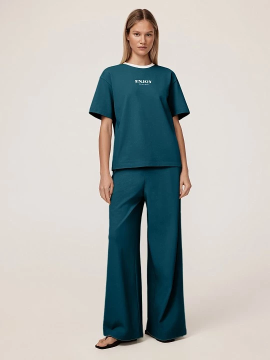 Брюки в традициях кэжуальной эстетики с элементами спортивного стиля — это сочетание стиля, комфорта и универсальности. Они выполнены из тактильно приятного хлопкового трикотажа, что обеспечивает натуральность, мягкость и приятные ощущения. Хлопок хорошо пропускает воздух, делая брюки комфортными для носки в теплое время года. Трикотаж обладает высокой эластичностью и способностью сохранять форму, обеспечивая удобство и практичность. Глубокий бирюзовый цвет «побережье Мексиканского залива» добавляет образу актуальности и выразительности. Крой брюк подчеркивает их универсальность: прямой крой обеспечивает комфорт и свободу движений, подчеркивая естественные линии фигуры. Широкая резинка со шнурком позволяет регулировать посадку, обеспечивая удобство и поддержку. Белые лампасы привлекают внимание, визуально вытягивая силуэт и делая брюки более актуальными и собранными.