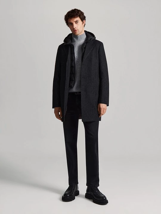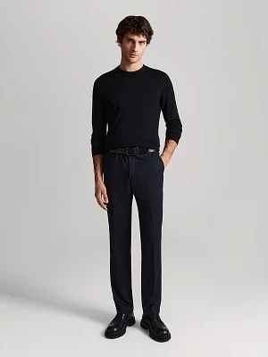 Прямые по ноге, слегка зауженные брюки из вискозной костюмной ткани на частичной подкладке. Полотно с фактурным узором, напоминающим соты, в темно-синем меланже. Ценность такой ткани в том, что при ее производстве используются нити разных оттенков основного цвета. Модель на притачном поясе, выполненном со шлевками, на корсажной ленте демонстрирует отличную посадку и дисциплинирует. Брюки с застежкой-гульфиком, косыми боковыми карманами, усиленными закрепками и задними карманами с листочкой и фиксацией на пуговицу. Для продления срока службы изделия по передним полотнищам брюк добавлена частичная подкладка, той же подкладочной тканью с изнаночной стороны закрыта застежка. Темно-синие базовые брюки станут удачным дополнением к неформальным офисным пиджакам, рубашкам, свитшотам, водолазкам, свитерам и джемперам.