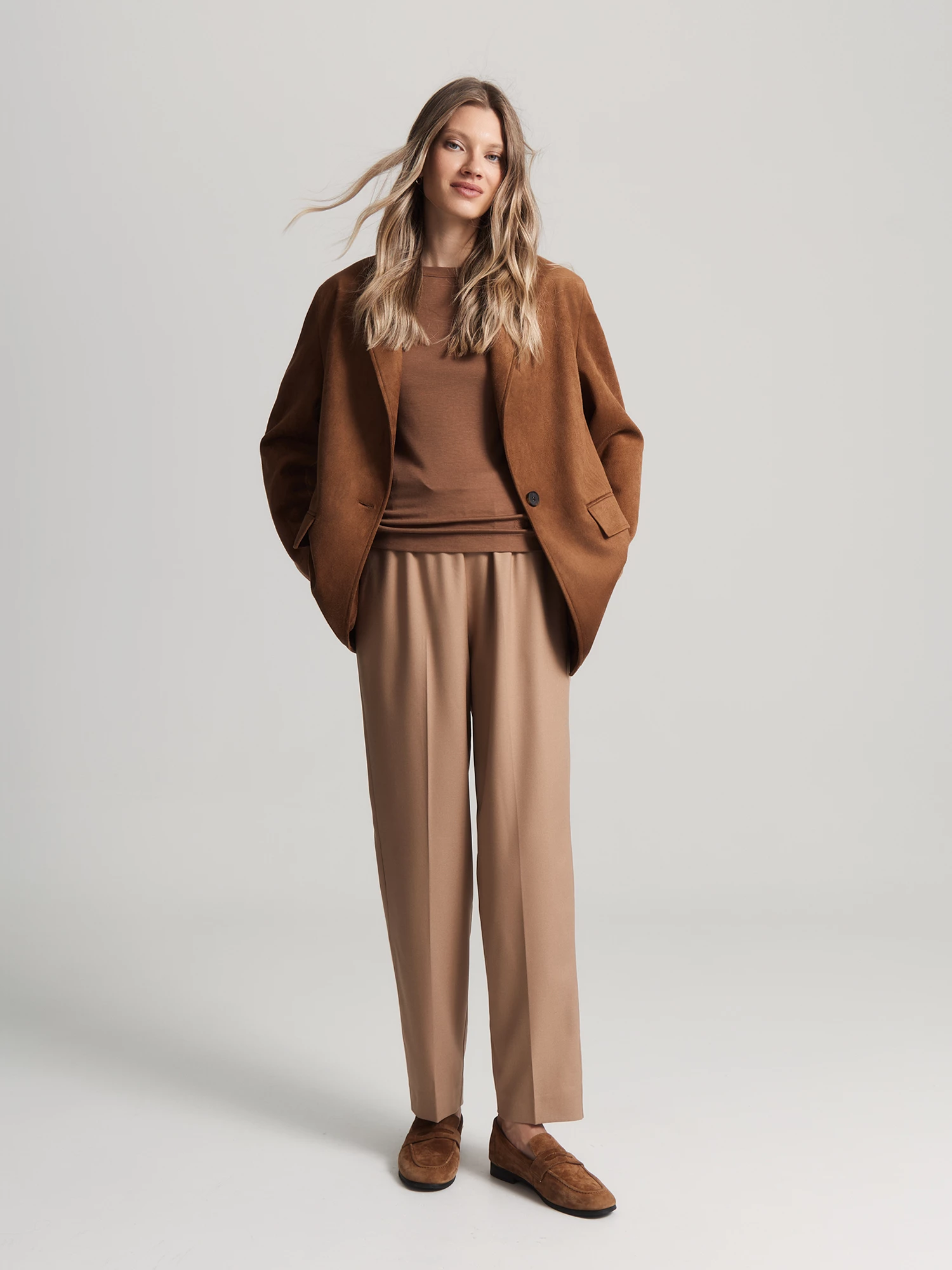 Нежный песочный цвет легко сочетается с разными оттенками. Такие брюки прекрасно завершат образы с блузами и джемперами коллекции.