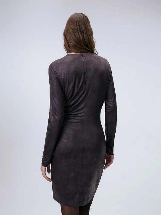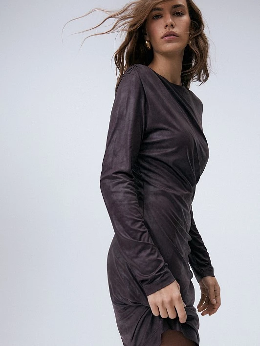 Платье полуприлегающего силуэта в цвете "горький шоколад". Модель с классическим круглым вырезом и длиной выше колена. Сборка у плеча позволяет получить красивое облегание по груди, а драпировка по линии талии и бедра обеспечивает хорошую посадку нижней части платья. Модель выполнена из высокотехнологичной итальянской ткани, повторяющей фактуру тонкой кожи. Полотно прочное, износостойкое, имеет привлекательный легкий блеск и красиво драпируется. Спандекс в составе способствует формоустойчивости изделия, а подкладка из 100% вискозы обеспечивает дополнительный комфорт. Платье универсально и будет востребовано как повседневное, офисное, школьное, вечернее, нарядное, новогоднее.