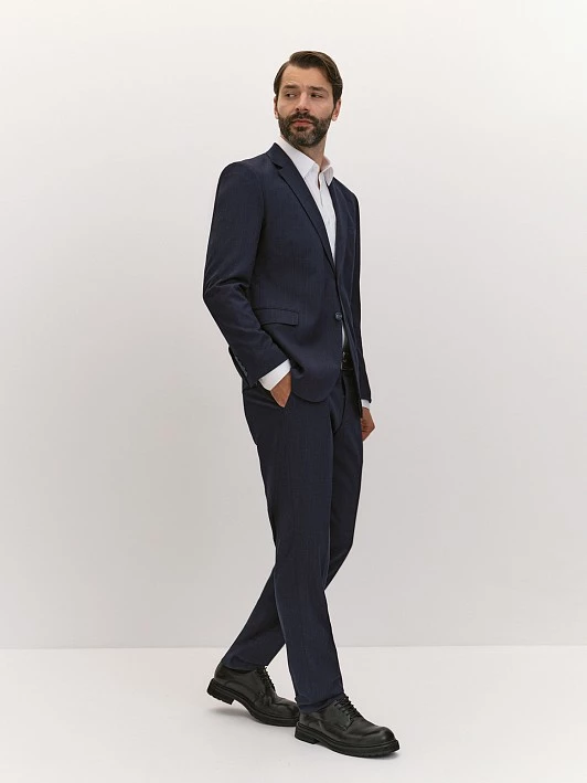 Зауженные брюки на притачном поясе со шлевками одновременно самодостаточны и прекрасно дополняют однобортный костюмный пиджак. Пояс на корсажной ленте обеспечивает отличную посадку и дисциплинирует. Брюки выполнены с традиционной застежкой-гульфиком, с косыми боковыми карманами, усиленными закрепками, и задними прорезными карманами в рамку с фиксацией на пуговицу. Для продления срока службы изделия и лучшей посадки брючин с плавным сужением добавлена частичная подкладка по передним полотнищам модели. Костюмная вискозная ткань хорошо подходит для создания мужских формальных брюк, она воздухопроницаема, долговечна, практически не мнется. Современная интерпретация виндзорской клетки в лаконичном черно-синем позволяет адаптировать модель в самые разные образы, брюки можно надеть в праздничный день, на выпускной, в школу, в офис.