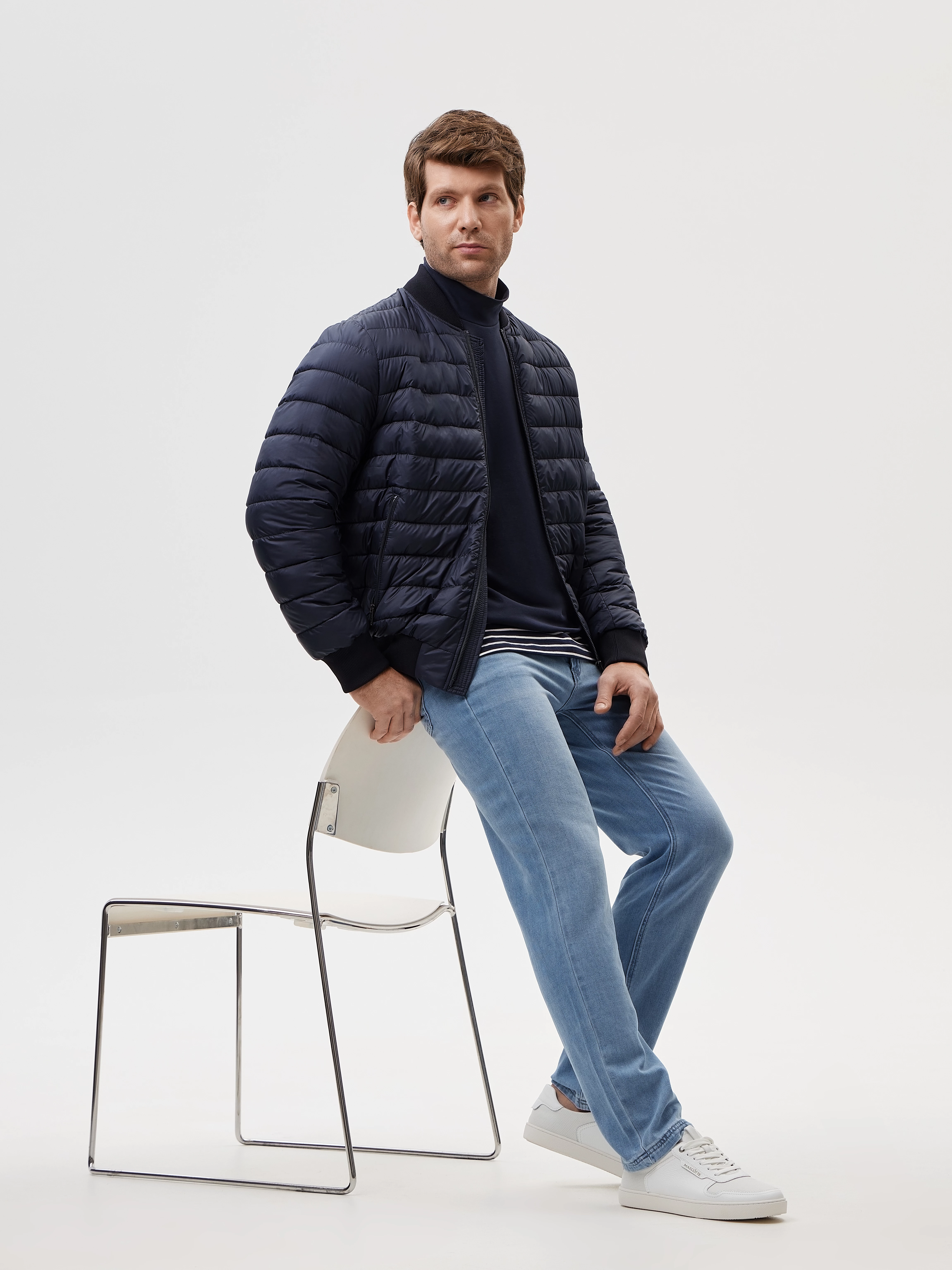 Стильный бомбер силуэта regular с горизонтальной стежкой подойдет для образа в спортивном, кэжуал и смарт кэжуал стиле. Модель хорошо защищает холодного ветра, выполнена с внутренним ветрозащитным клапаном и традиционными для бомбера подвязами по горловине, низу и рукавам. Благодаря полному циклу производства, подвязы созданы на собственной фабрике с помощью японских плосковязальных машин Shima Seiki. Для дополнительной функциональности, куртка дополнена прорезными боковыми карманами с вертикальным входом и внутренним карманом. Для стилизации бомбер декорирован круглым брендированным бейджем и молниями с брендированными пуллерами. Весенний тонкий пуховик выполнен из качественной плащевой ткани с влагозащитной пропиткой и утеплен синтепухом. Синтепух - это современный высокотехнологичный наполнитель, отличающийся легкостью, упругостью и хорошими теплоизоляционными свойствами. Благодаря горизонтальной стежке, выполненной на собственном производстве, наполнитель правильно распределен внутри изделия и надежно зафиксирован. Глубокий, контрастный и строгий темно-синий хорошо сочетается с денимом, моделями из костюмной ткани и из трикотажного полотна капсулы PERFECT BASE.
