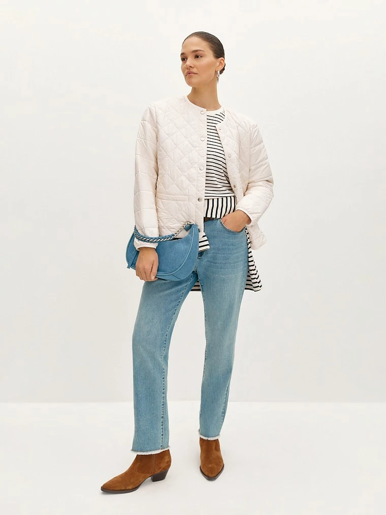 Лёгкая куртка нежного сливочного оттенка с комбинированной авторской простёжкой. Выполнена из прочного, не продуваемого материала, утеплитель с добавлением шерсти мериноса обеспечивает поддержание оптимальной температуры. Прямой силуэт и длинный рукав с эластичным кантом на манжете обеспечивают свободу движений, а карманы с листочкой делают куртку функциональной. Застежка на металлические кнопки добавляет удобство, а лаконичный дизайн позволяет сочетать куртку с любым образом.