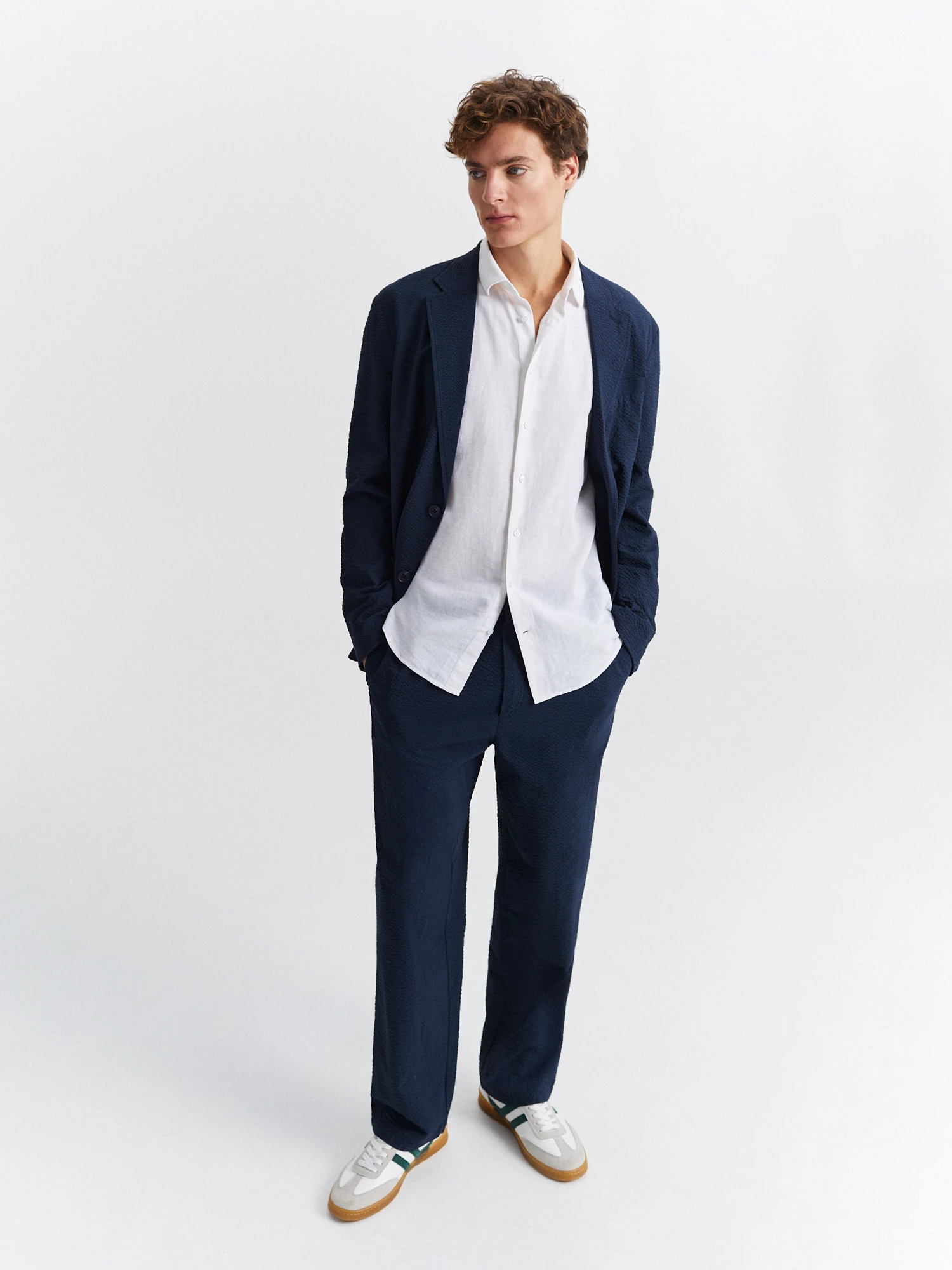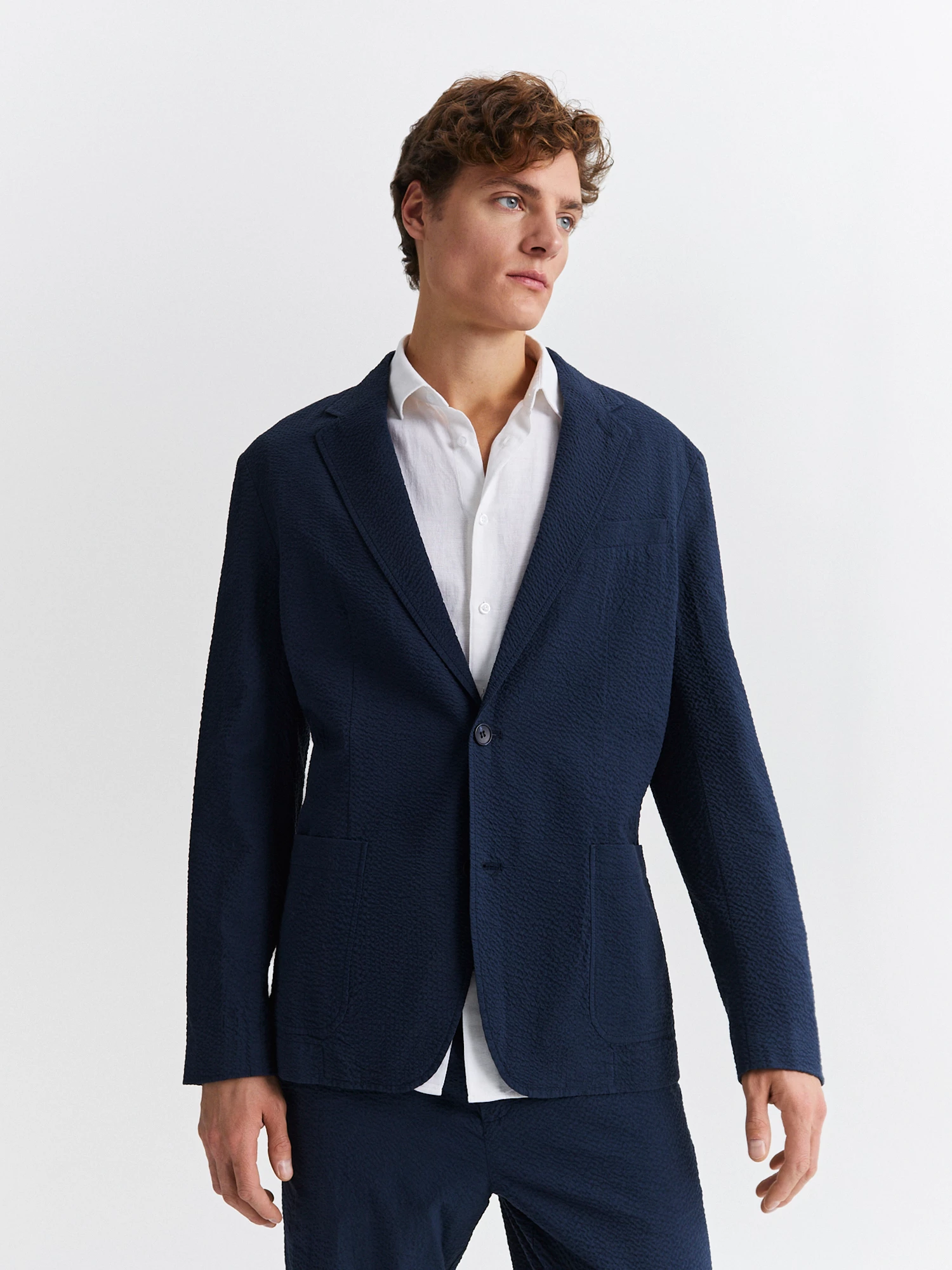 Фактурный однобортный пиджак темно-синего цвета. Жатое крэш-полотно из натурального дышащего хлопка не нуждается в ежедневном отпаривании и надолго сохраняет первоначальный внешний вид. Модель прямого силуэта с прямоугольными лацканами, застёжкой на две пуговицы, накладными карманами, карманом с листочкой на груди и двумя шлицами. Пиджак идеально подойдет к брюкам из этой же ткани, а актуальная жатая фактура в сочетании с лаконичным дизайном добавляют образу оригинальность.