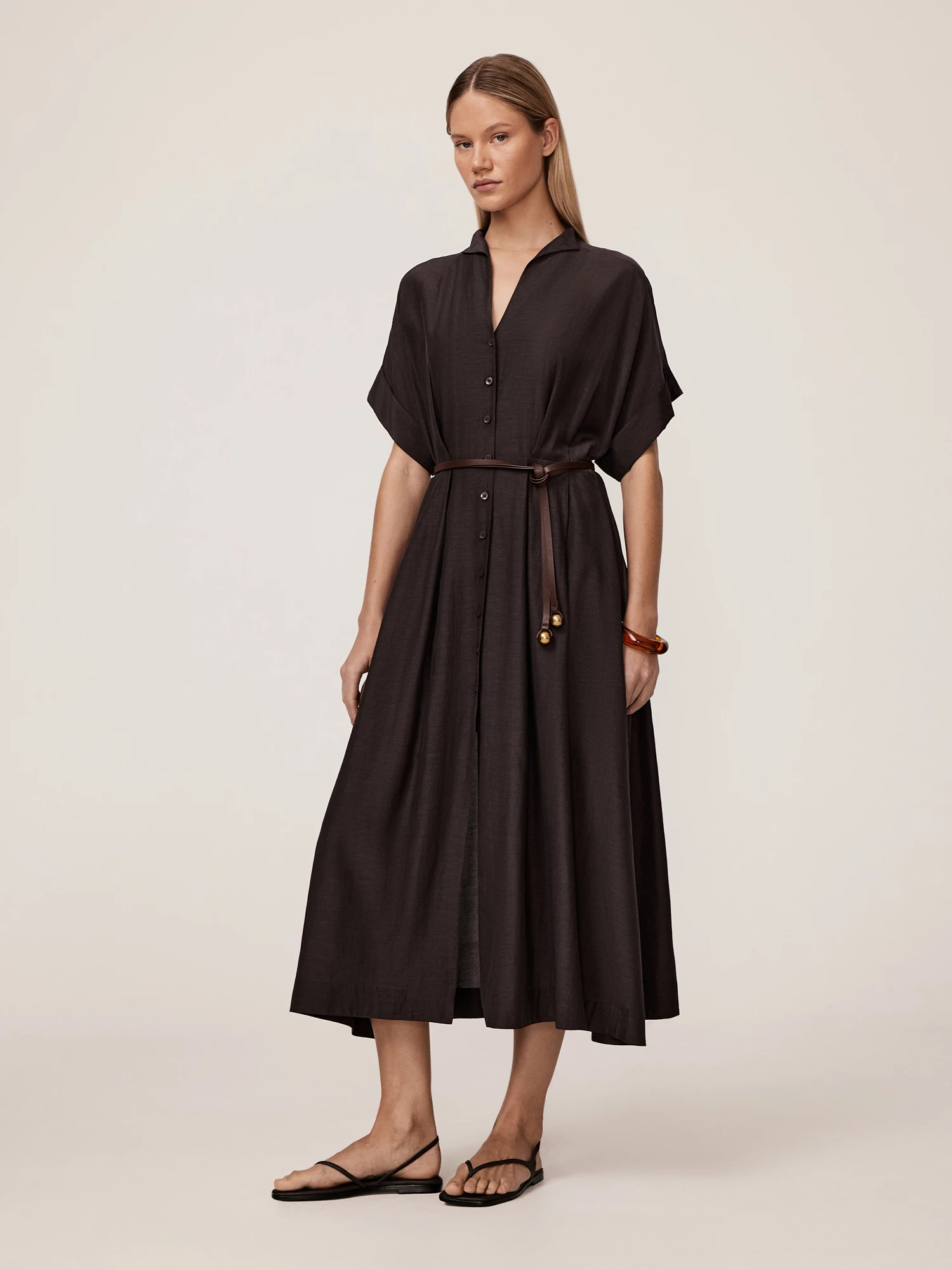 Платье силуэта, вдохновленного романтичным стилем new look от Christian Dior: воздушные бантовые складки, расходящиеся от талии, создают эффект тюльпана, а слегка заутюженные отвороты горловины формируют элегантный V-вырез, подчеркивающий женственную линию ключиц. Цельнокроеный рукав с отворотами — оптимальное решение, позволяющее отказаться от классических вытачек, сохранив гладкость ткани, такой прием обеспечивает безупречную посадку, сохраняя свободу движений и расширяет стилистическую вариативность модели. Роскошь ткани, созданной в солнечной Турции, прекрасно оттеняет эффектную модель. Хлопок отвечает за максимальный комфорт и воздухопроницаемость, а вискоза за внешний вид премиального полотна - она дарует ткани шелковистую текстуру и деликатный блеск. Глубокий шоколадно-коричневый тон платья делает кожу сияющей, это глубокий, насыщенный оттенок, напоминающий цвет горького шоколада. Этот благородный цвет ассоциируется с актуальным стилем "тихая роскошь" и природной элегантностью. Легкое приталенное платье - настоящий хамелеон гардероба, в зависимости от подобранных обуви и аксессуаров, модель можно адаптировать в кэжуальный, вечерний образ, и даже добавить к ней элементы в стиле спорт-шик.