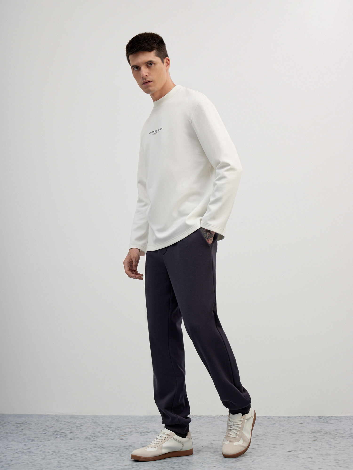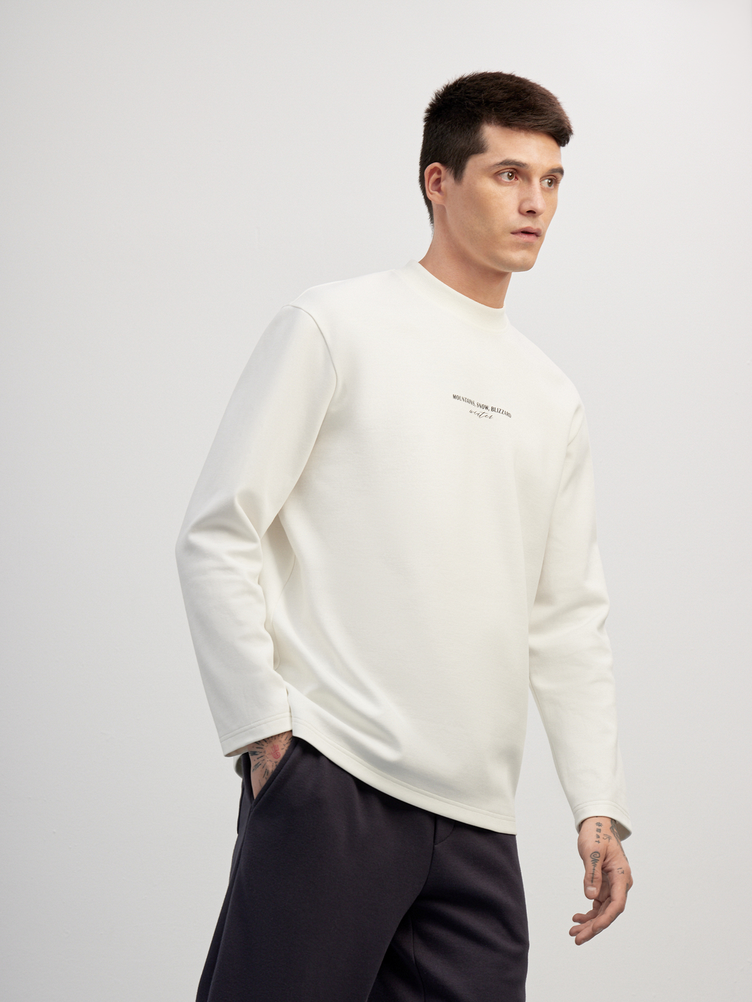 Лаконичный лонгслив с акцентной деталью - минималистичным принтом контрастного цвета. Модель выполнили из плотного и гладкого на ощупь хлопкового трикотажа, материал хорошо тянется и не препятствует циркуляции воздуха. Прямой крой модели, ворот - полустойка и чуть спущенная линия плеча обеспечивают удобную посадку по фигуре. Советуем сочетать лонгслив с трикотажными брюками или джинсами нейтральных оттенков. .