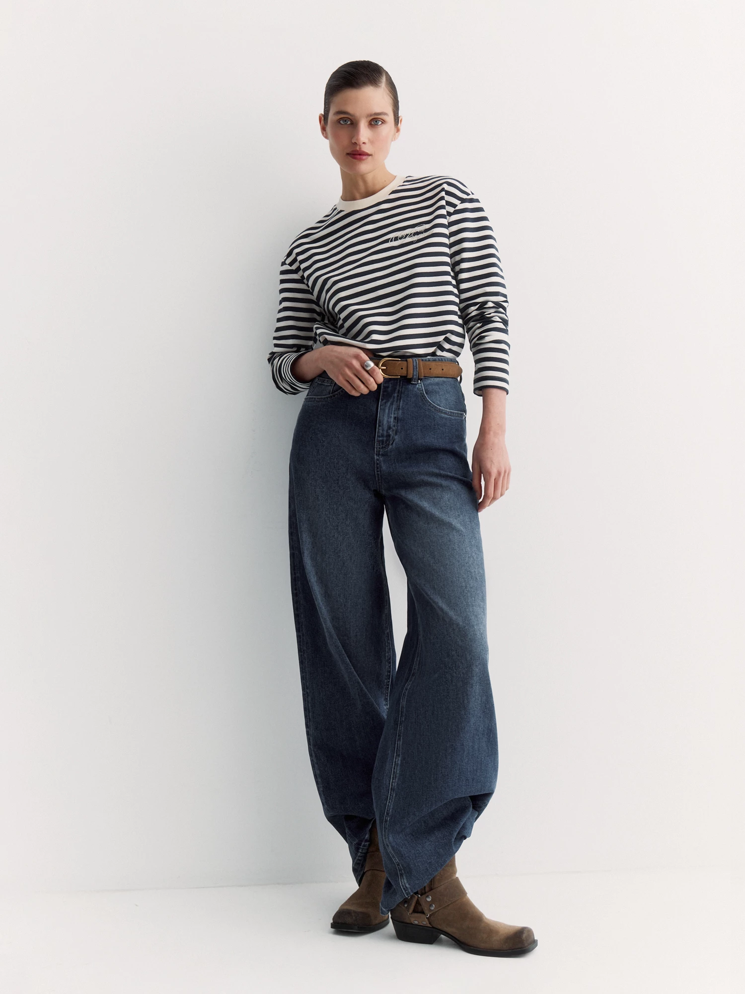 Бело-синий лонгслив в полоску — невероятно комфортен и напоминает о французском стиле. Прямой крой, спущенное плечо и длинные рукава формируют легкий овер, а аккуратная отделка горловины трикотажем рибана добавляет модели завершённости.