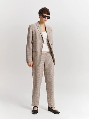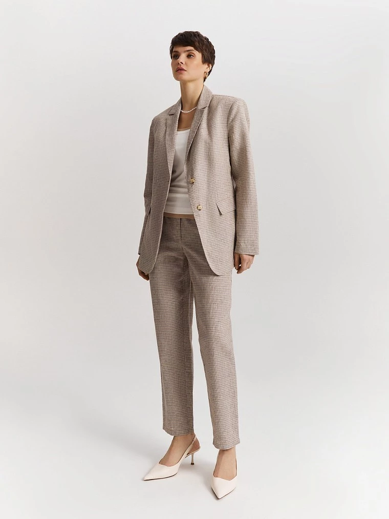 Однобортный жакет мягкого бежевого оттенка с деликатным геометрическим принтом в клетку. Премиальная льняная ткань с добавлением натуральных волокон хлопка идеальна в жаркий сезон. Материал легко пропускает воздух и поддерживает оптимальную температуру. Жакет свободного прямого силуэта со скругленными полами, английским воротником с прямыми лацканами и прорезными карманами с клапанами. Для создания стильного однотонного total look рекомендуем комбинировать жакет с юбкой-мини или брюками из нашей коллекции.