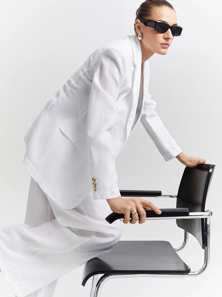 Однобортный жакет чистого белого цвета. Натуральный невесомый лён легко пропускает воздух, поддерживает оптимальную температуру и обеспечивает максимальный комфорт. Жакет свободного прямого силуэта со скругленными полами, английским воротником с прямыми лацканами и прорезными карманами с клапанами. Для создания стильного тоtotal look рекомендуем комбинировать жакет с широкими брюками из нашей коллекции.