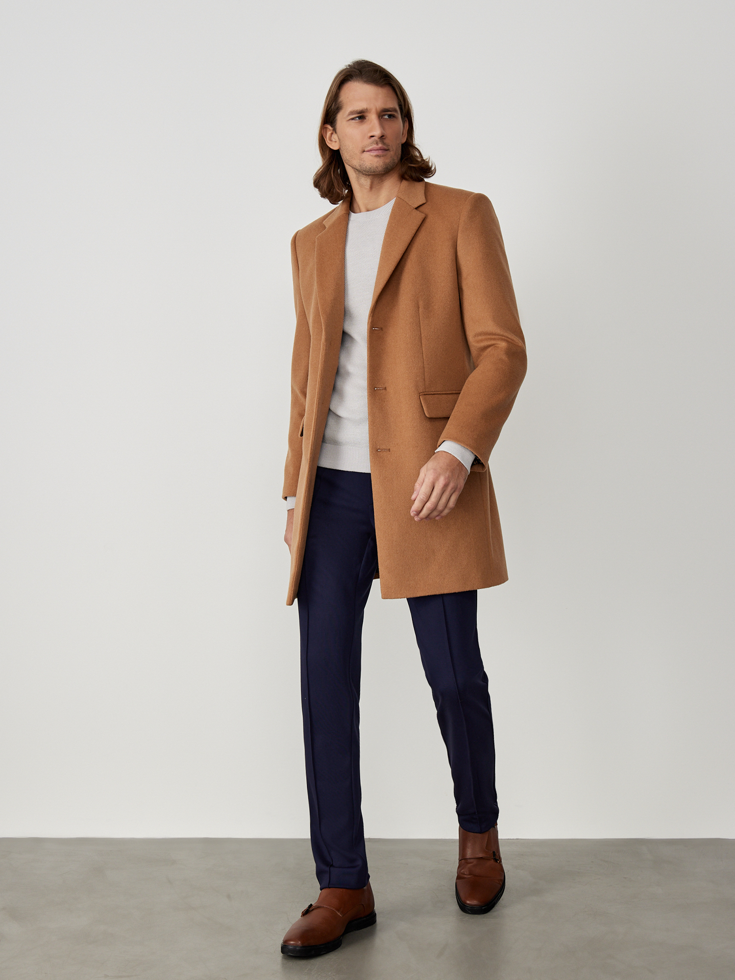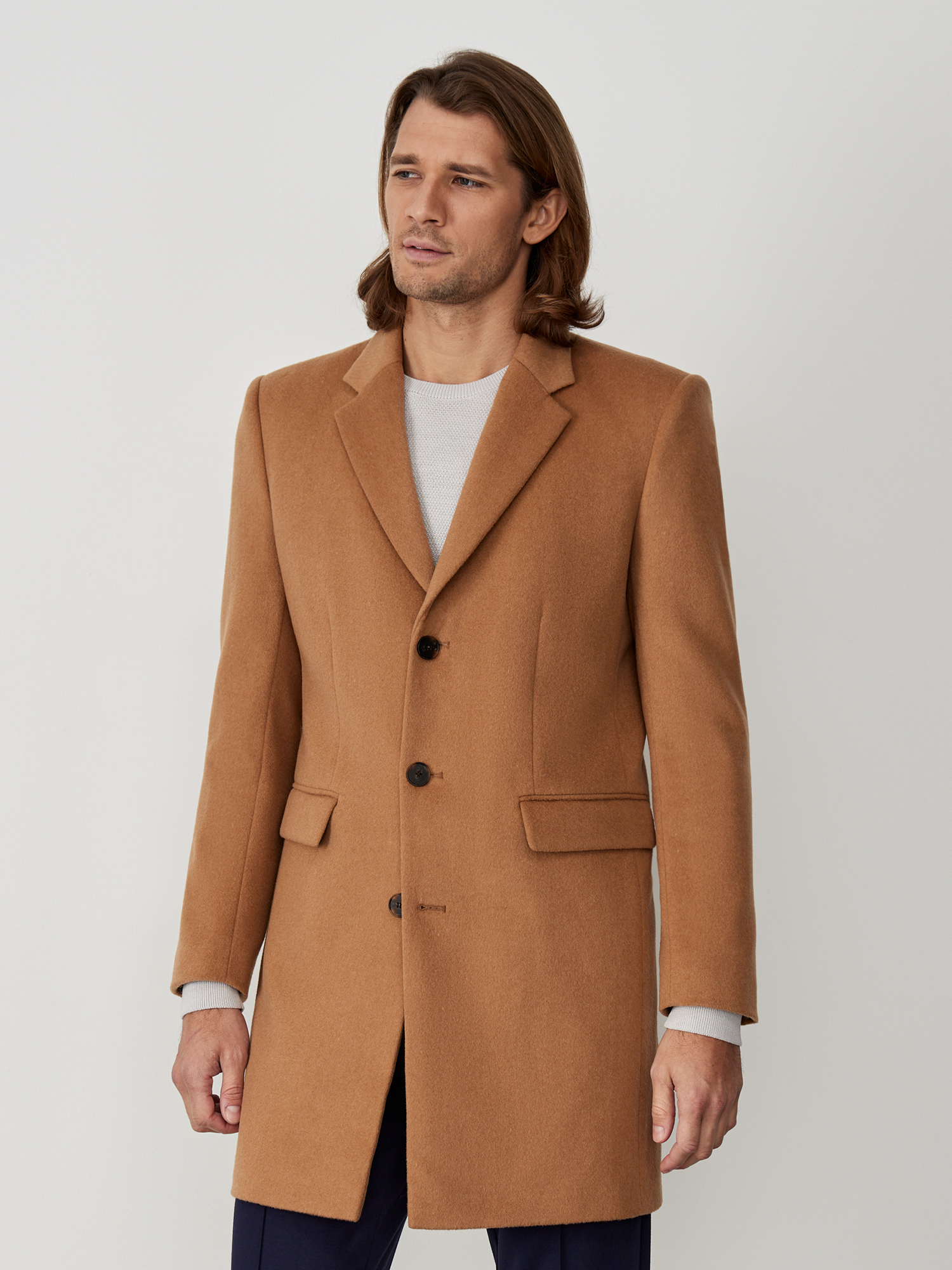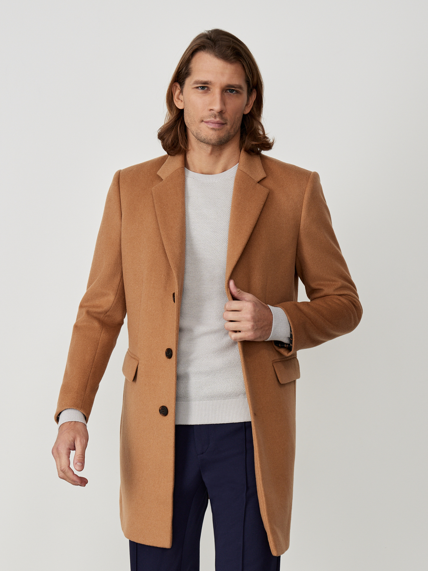 Базовое пальто для демисезонного делового гардероба из теплого драпа на основе овечьей шерсти. Прямой крой, универсальная длина и песочный оттенок делают вещь абсолютной классикой на многие сезоны вперед. Модель с лаконичным силуэтом без лишних деталей с отложным английским воротником и однобортной застежкой на три крупные пуговицы. Сзади шлица. По бокам прорезные карманы с отстроченными клапанами. Дизайнерская деталь: гладкая подкладка в тон основной материи с фирменным рисунком в полоску. Такое пальто легко сочетать с любыми вещами офисного и кэжуального гардероба: джинсами, деловыми костюмами, повседневными брюками. Также пальто будет отлично сочетаться с городскими кожаными рюкзаками и объемными шарфами.