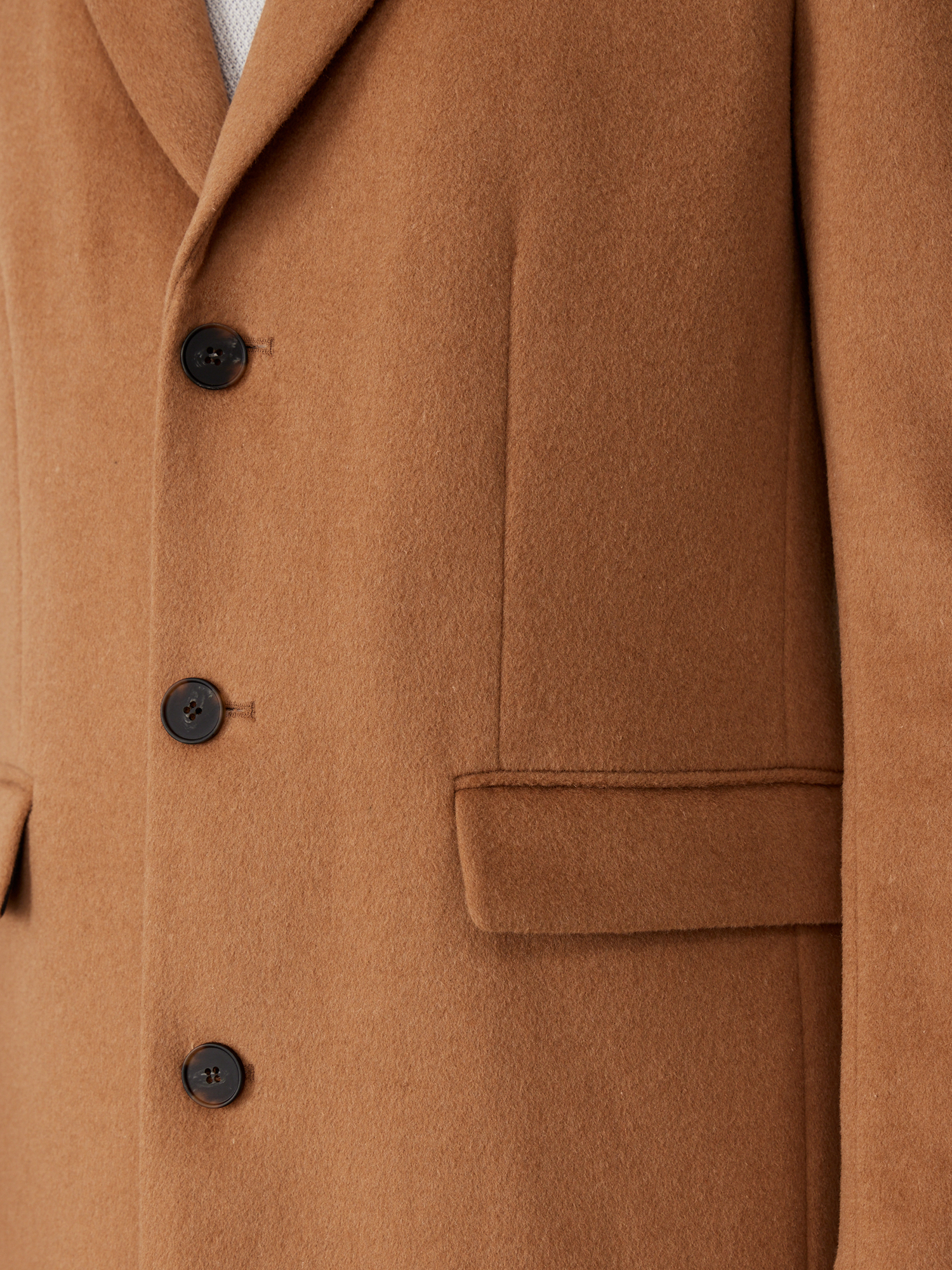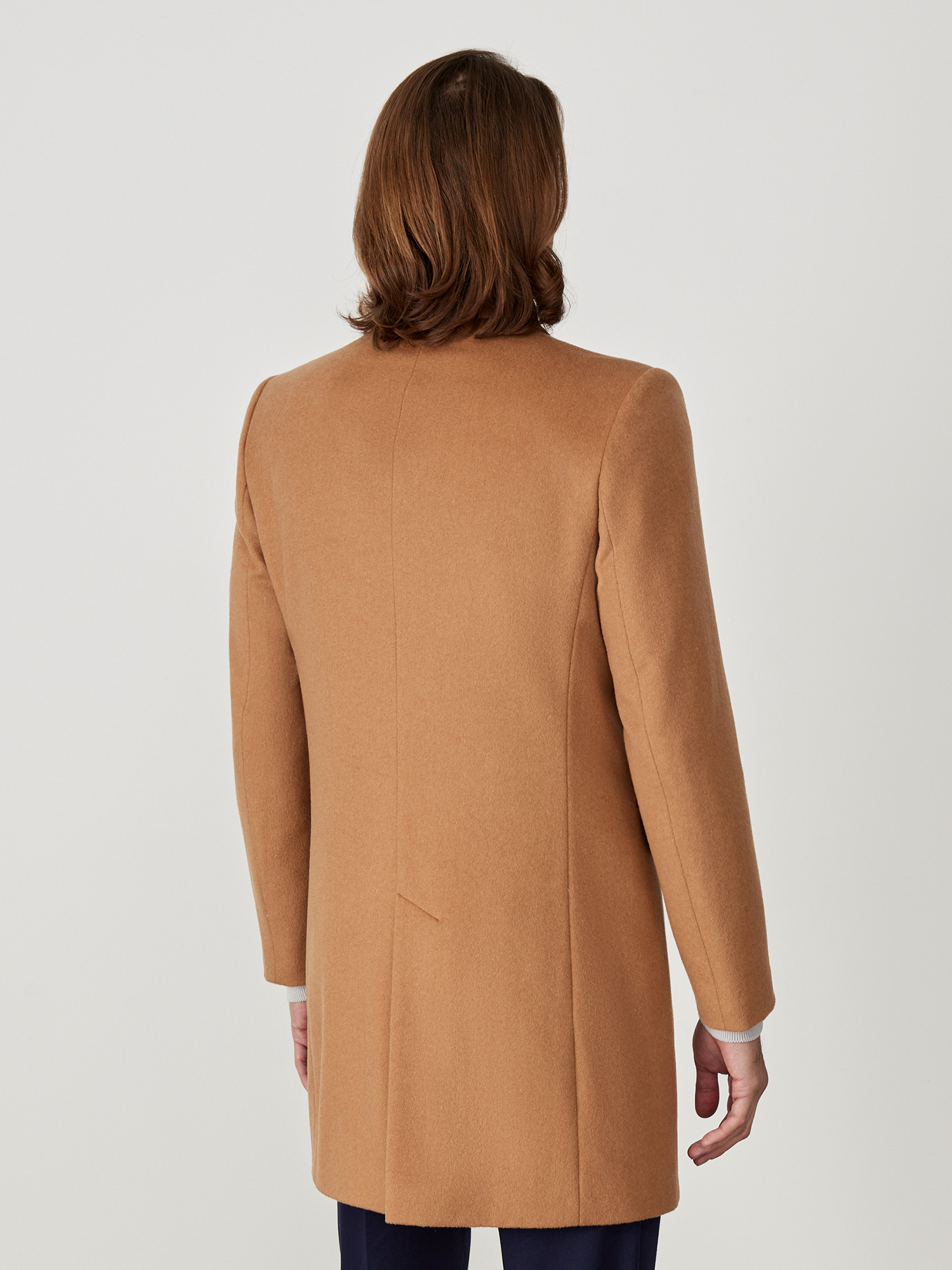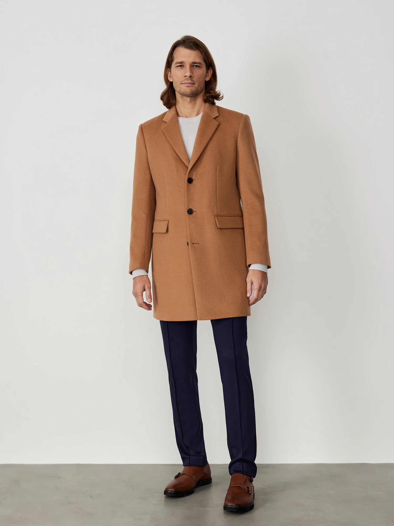 Базовое пальто для демисезонного делового гардероба из теплого драпа на основе овечьей шерсти. Прямой крой, универсальная длина и песочный оттенок делают вещь абсолютной классикой на многие сезоны вперед. Модель с лаконичным силуэтом без лишних деталей с отложным английским воротником и однобортной застежкой на три крупные пуговицы. Сзади шлица. По бокам прорезные карманы с отстроченными клапанами. Дизайнерская деталь: гладкая подкладка в тон основной материи с фирменным рисунком в полоску. Такое пальто легко сочетать с любыми вещами офисного и кэжуального гардероба: джинсами, деловыми костюмами, повседневными брюками. Также пальто будет отлично сочетаться с городскими кожаными рюкзаками и объемными шарфами.
