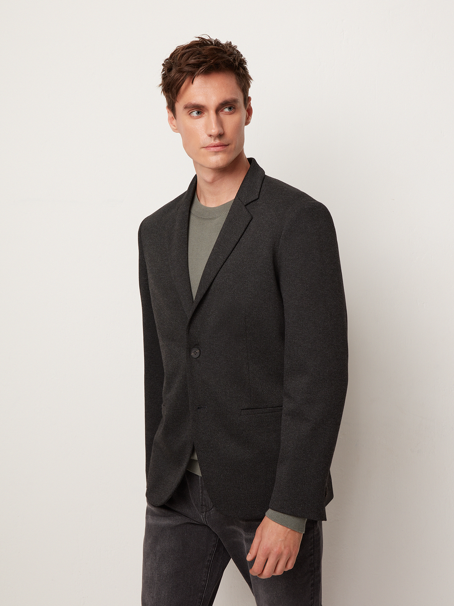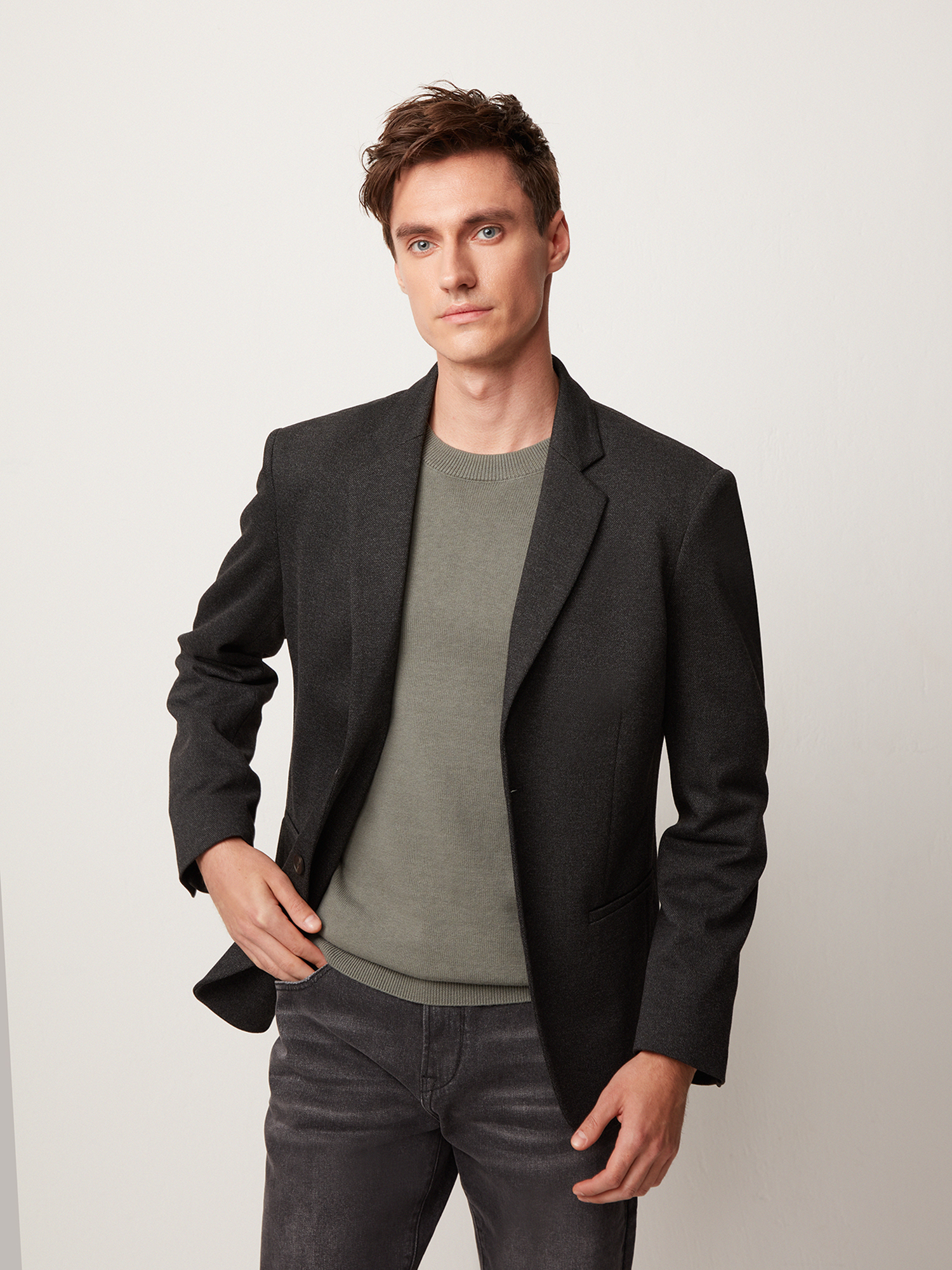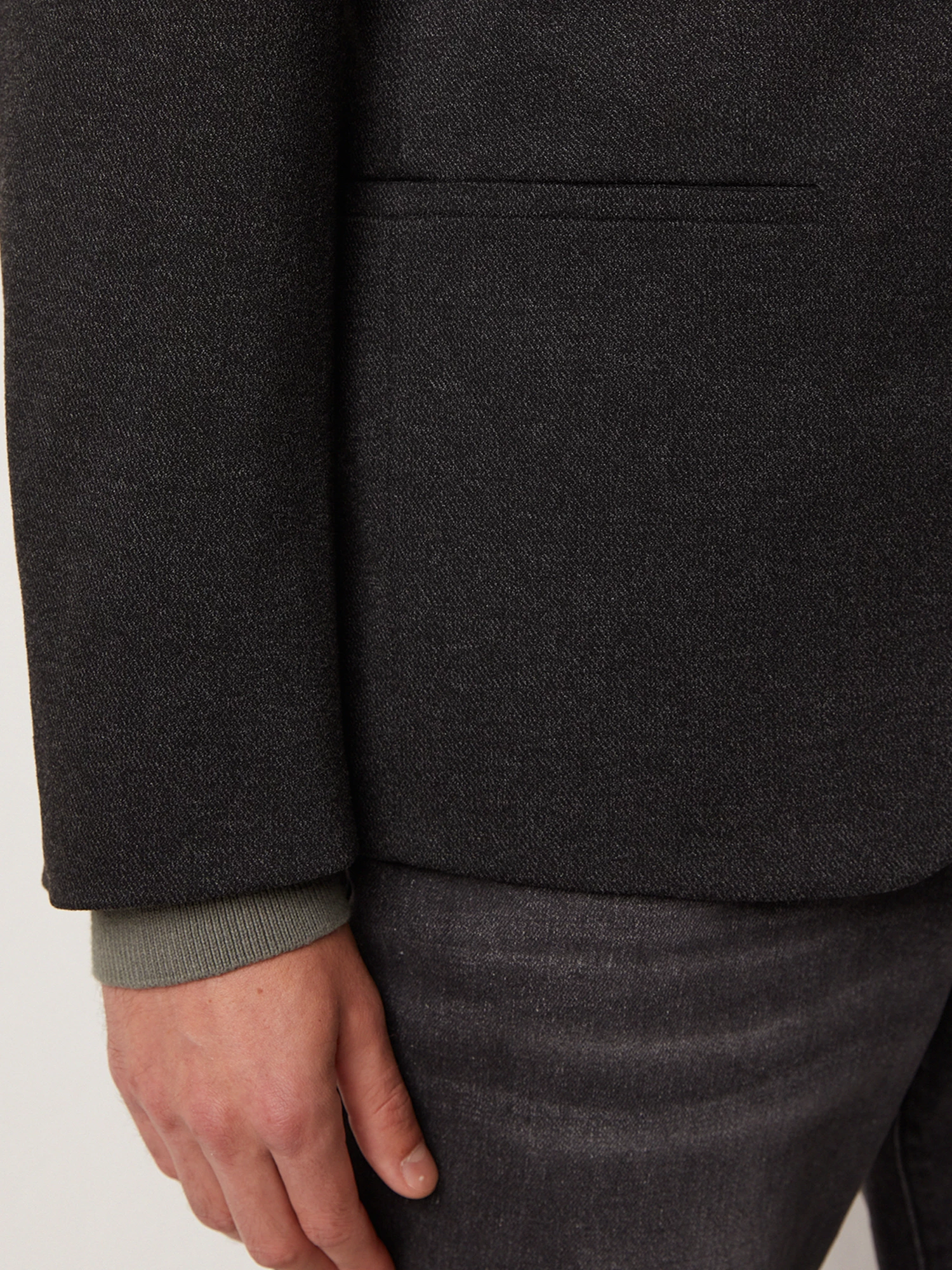 Базовый однобортный пиджак цвета черный меланж из трикотажа. Модель прямого силуэта с отложным воротником с прямым лацканом, втачным двухшовным рукавом с двумя пуговицами сзади, центральной застёжкой на две пуговицы, карманами с листочкой, в среднем шве спинки шлица. Универсальный пиджак можно дополнить как брюками, так и чиносами или джинсами.