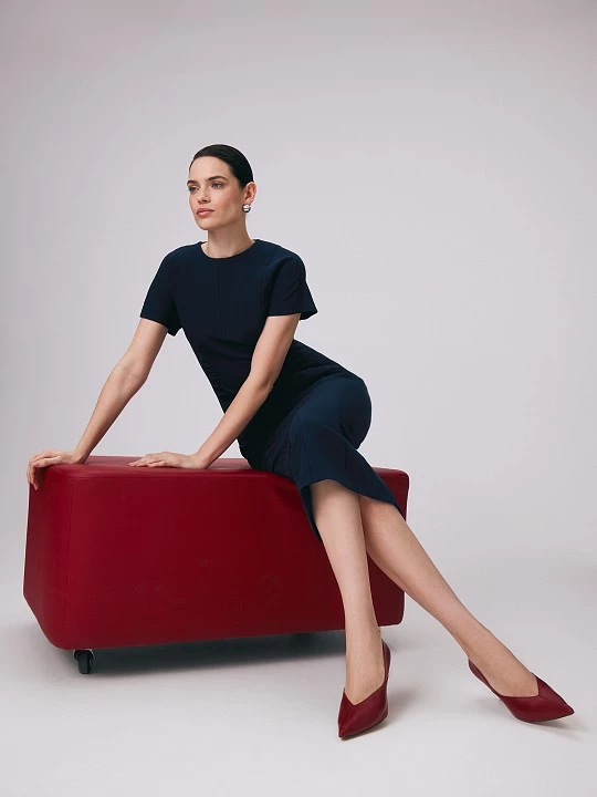 Платье с идеальными вертикальными рельефами подчеркивает и одновременно моделирует фигуру. Секрет в грамотном сочетании необычного кроя с эластичностью костюмной ткани. Модель длины миди выполнена с аккуратным круглым вырезом и застежкой сзади на потайную молнию. Вертикальные швы бесконечно вытягивают силуэт, а сборка вдоль рельефов способствует формированию силуэта "песочные часы". Создали платье со шлицей для комфортного шага. Модель выполнена из супер-эластичной костюмной вискозной ткани, она формоустойчива, долговечна и воздухопроницаема. Выбранный для платья элегантный и лаконичный темно-синий Vulcan (рус. "вулкан") дает неограниченные возможности для создания образов самой разной стилистики.