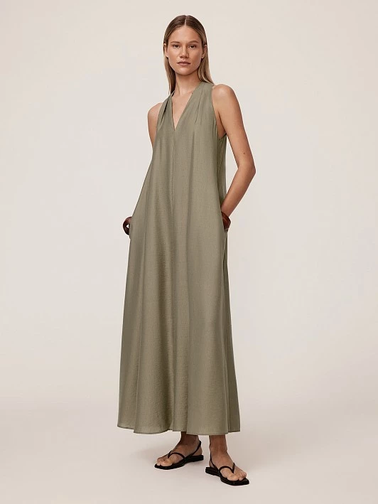 Платье особого кроя создано для женщин, ценящих внимание к деталям. А-силуэт с заложенными складками по бретелям создает эффект легкого движения, напоминая игру световых бликов на водной глади, а лаконичный V-вырез подчеркивает изящество нежной шеи. Эффектный крой спинки с фиксацией бретелей в замок и расходящейся складкой продолжает правильное расклешение и вызывает визуальный интерес. Широкие сложные бретели и отсутствие вытачек обеспечивают комфорт, а карманы, скрытые в швах, добавляют практичности, не перегружая модель. Сочетание вискозы, лиоцелла и нейлона позволило выбрать для модели ткань привлекательно драпирующуюся, легкую, с визуально интересным эффектом крэш. Дышащая легкая вискоза прекрасно сочетается с мягким и шелковистым лиоцеллом и дополняется практичным нейлоном, прочным и ответственным за сохранность крэш-эффекта. Сложный серо-зеленый оттенок, напоминающий цвет волн в пасмурный день, отлично подходит для такой ткани. Цвет под названием "русалка" меняет характер в зависимости от освещения и оттенков моделей-компаньонов. Такое платье составит как оригинальный образ smart casual в сочетании с жакетом, так и коктейльный look, если дополнить его изящными аксессуарами.