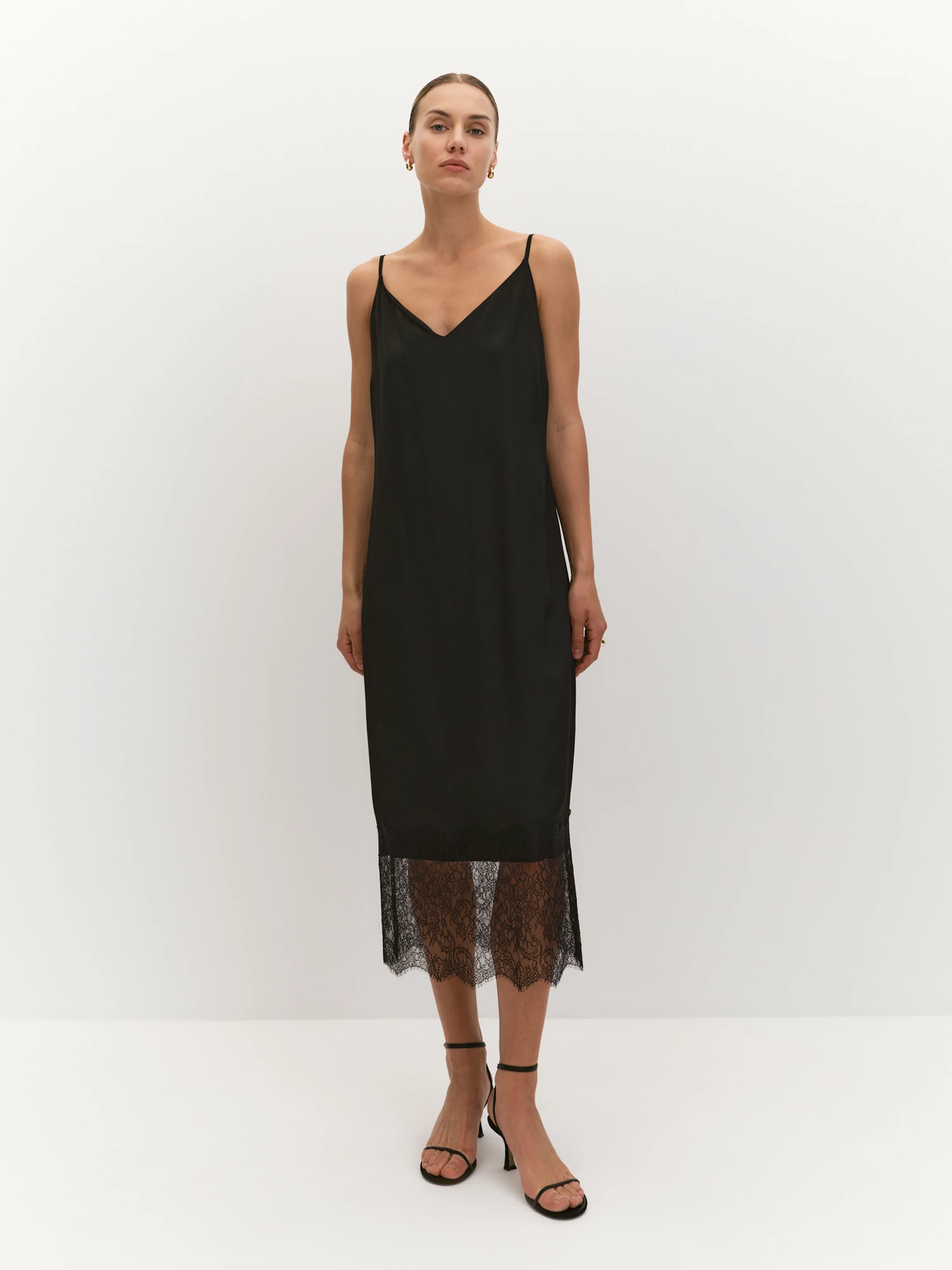 Модель в бельевом стиле, которая станет настоящим украшением Вашего гардероба. Элегантное черное платье-комбинация привлекает внимание своей утонченной эстетикой и изысканными деталями. Платье выполнено из легкой и воздушной ткани, которая обеспечивает комфорт и свободу движений. Основной акцент в дизайне сделан на красивом кружеве с флоральным рисунком, которое обрамляет изделие и придает ему особую нежность и шарм. Это кружево не только украшает изделие, но и создает эффект легкости, благодаря чему модель выглядит романтично и стильно. Низ платья дополнен игривыми ресничками, которые добавляют динамики и подчеркивают воздушность образа. V-вырез в области декольте акцентирует внимание на линии шеи и придает образу смелость, делая его более выразительным и привлекательным. Регулируемые бретели позволяют адаптировать платье под любые параметры фигуры, обеспечивая идеальную посадку и комфорт. Это особенно важно для создания гармоничного силуэта и уверенности в себе. Ткань платья обладает легкой текстурой, что придает ему особую элегантность. Вискоза, использованная в составе, дарит материалу красивый блеск и плавность, а добавление регенерированной целлюлозы обеспечивает необходимую структуру и форму. Это сочетание делает платье-комбинацию универсальным, позволяя легко комбинировать его как с повседневными, так и с более формальными аксессуарами. Таким образом, это платье в бельевом стиле — отличный выбор для тех, кто ценит утонченность, комфорт и стиль в своей одежде. Оно идеально подходит для различных мероприятий, будь то вечерняя прогулка, романтический ужин или светское мероприятие. В нем Вы всегда будете выглядеть безупречно и привлекательно.