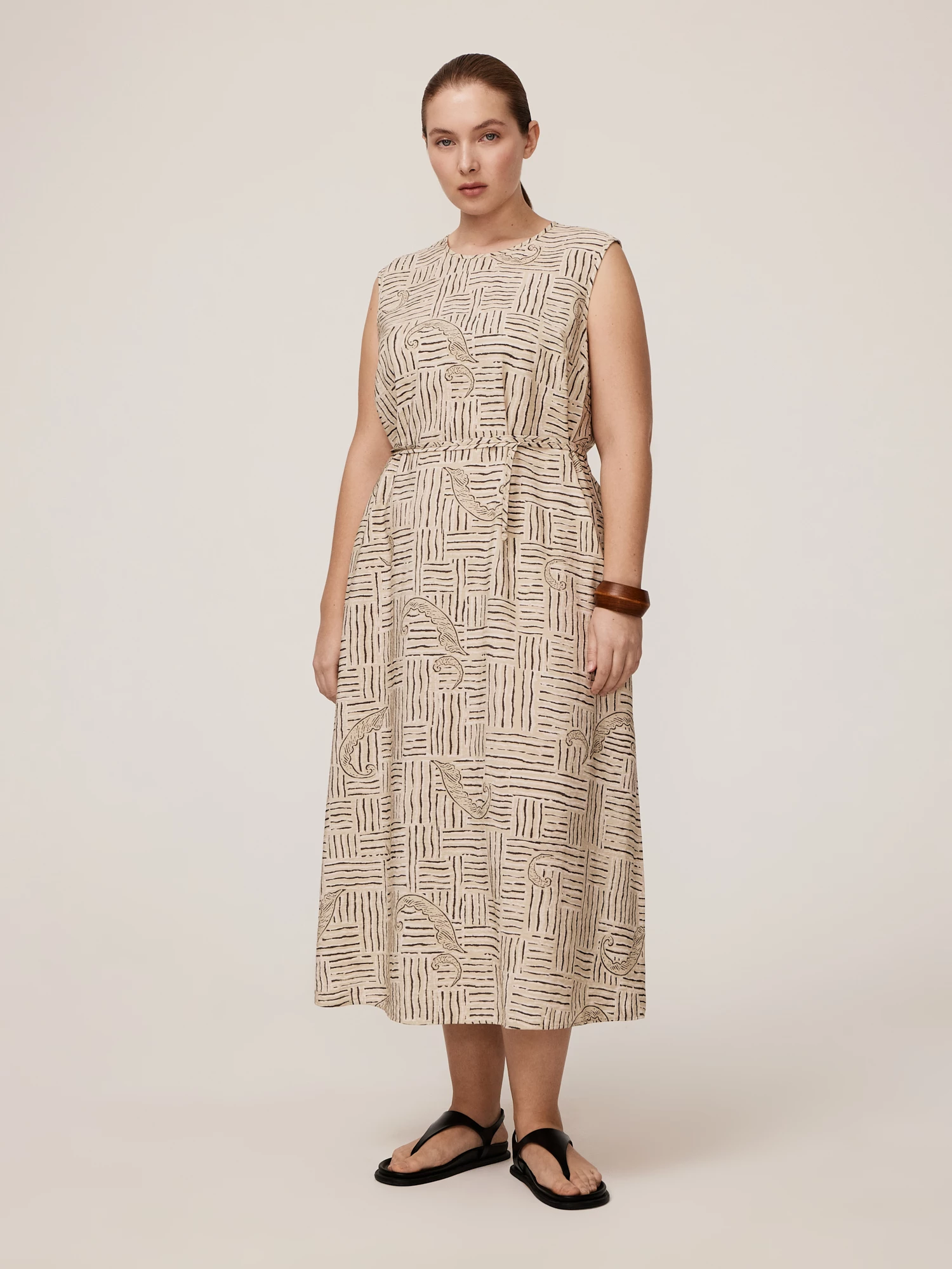 Легкое и струящееся платье из ткани, где строгие линии оживают благодаря растительным мотивам. Такой рисунок не выглядит холодным или строгим, он делает образ динамичным благодаря балансу между современной лаконичностью и теплой естественностью. Созданная из высококачественной турецкой вискозы, усиленной полиамидом, модель дарит коже ощущение свежести даже в самый жаркий день — ткань прекрасно пропускает воздух, впитывает влагу и мягко струится по фигуре, создавая эффект невесомой элегантности. Практичный полиамид сохраняет безупречный вид изделия — оно меньше мнётся, быстро сохнет после стирки и устойчиво к деформации, позволяя Вам всегда выглядеть безупречно без лишних усилий. Круглый вырез подчеркивает простоту и элегантность платья, ставя во главу угла эффектный рисунок. Отсутствие рукавов придает изделию легкость, а достаточная длина – универсальность. Пояс из основной ткани позволяет регулировать степень прилегания и расширяет вариативность модели. Смелое и в то же время женственное платье станет идеальным спутником как для городских прогулок, так и для особых случаев.