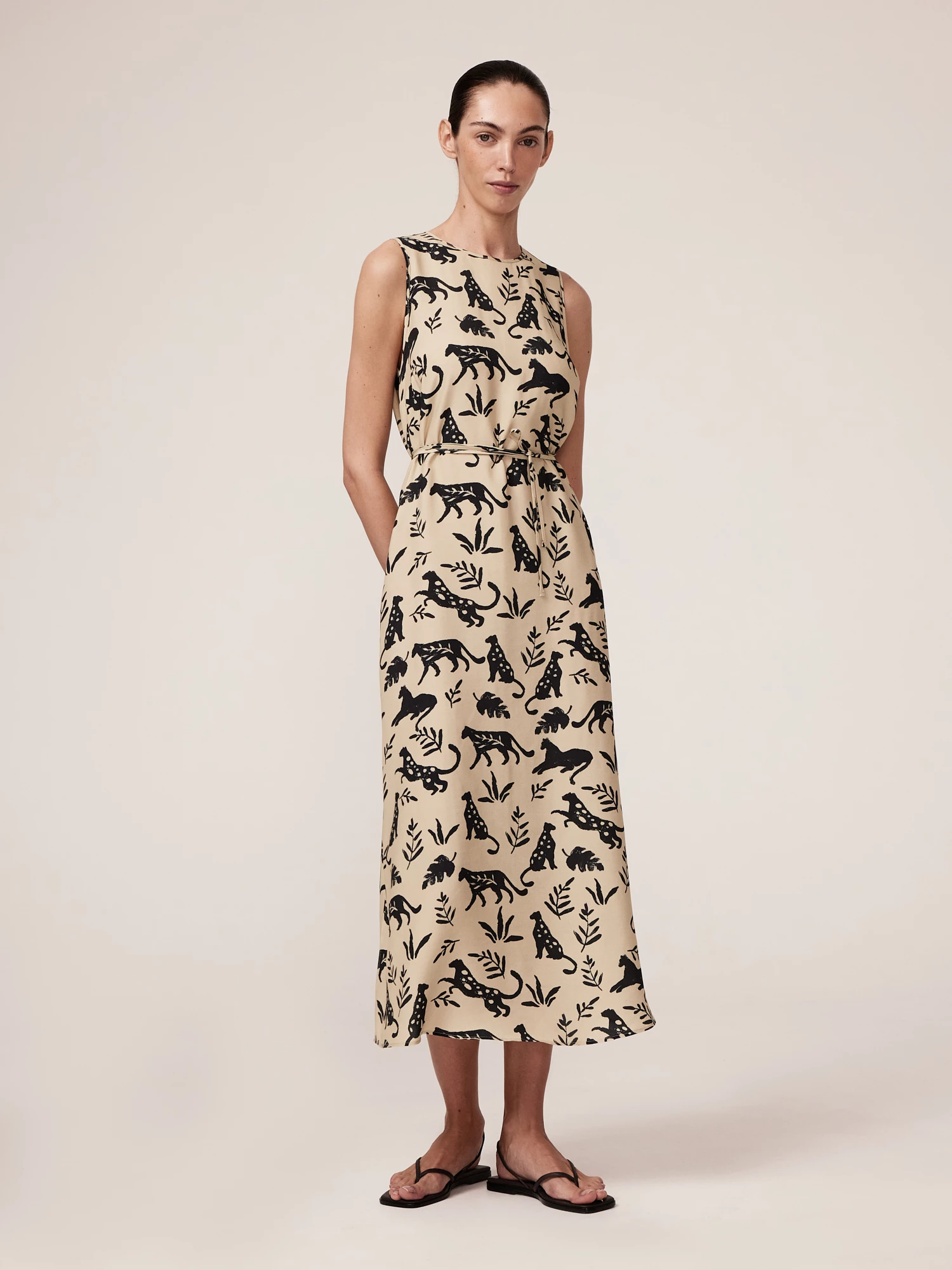 Легкое и струящееся платье из ткани, где силуэты диких кошек и растений составляют динамичный рисунок, добавляя образу загадочности и движения. Дополнительную уверенность модели придает сочетание цветов - стильный черный на фоне песочного с перламутровым подтоном смотрится особенно убедительно. Созданная из высококачественной турецкой вискозы, модель дарит коже ощущение свежести даже в самый жаркий день — ткань прекрасно пропускает воздух, впитывает влагу и мягко струится по фигуре, создавая эффект невесомой элегантности. Круглый вырез подчеркивает простоту и элегантность платья, ставя во главу угла эффектный рисунок. Отсутствие рукавов придает изделию легкость, а высокие боковые разрезы – намек на дерзость. Пояс из основной ткани позволяет регулировать степень прилегания и расширяет вариативность модели. Смелое и в то же время женственное платье станет идеальным спутником как для городских прогулок, так и для особых случаев.