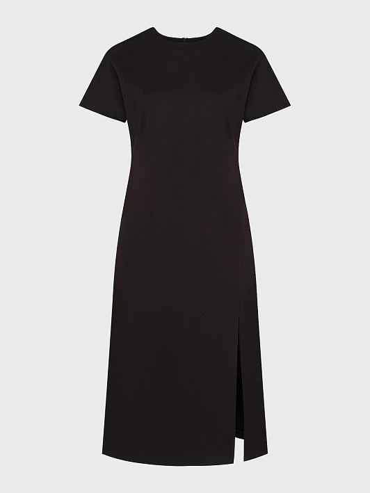 Черное платье, демонстрирующее полуприлегание - утонченное сочетание элегантности и комфорта. Мягкое расклешение от талии подчеркивает изгибы фигуры, а круглый вырез и короткие цельнокроеные рукава придают образу лаконичную сдержанность.