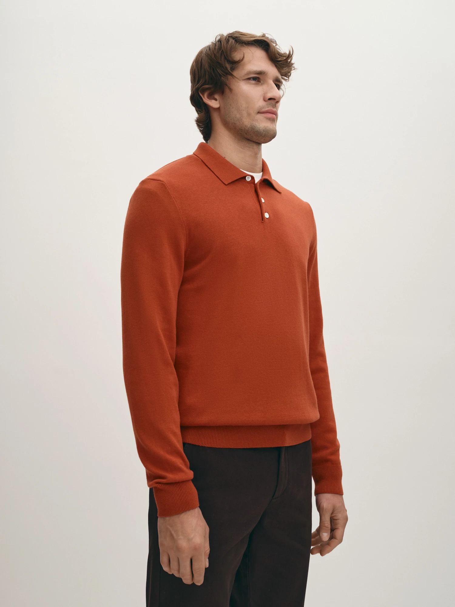 Вязаное поло терракотового оттенка. Изготовлено из эластичной, износостойкой пряжи, в состав которой входит натуральный хлопок и шерсть мериноса. Модель с воротником на пуговицах и длинными рукавами выгодно подчеркивает фигуру, благодаря полуприлегающему силуэту. Поло станет удачным дополнением к образу в стиле кэжуал и хорошо сочетается с классическими брюками и джинсами.
