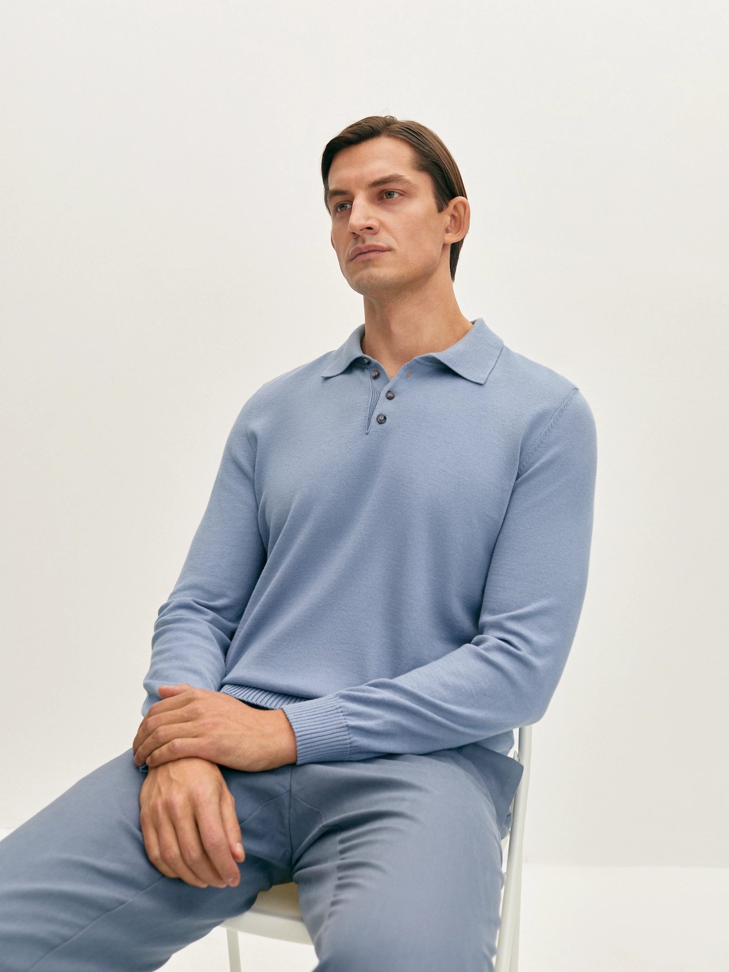 Вязаное поло голубого оттенка полуприлегающего силуэта, с отложным воротником с застёжкой на пуговицы и длинным рукавом с манжетами. Модель выполнена в тонкой гладкой вязке из натурального хлопка. Это мягкий, прочный, приятный на ощупь материал, который при правильном уходе отлично сохраняет превосходный внешний вид. Лаконичное базовое поло прекрасно дополнит гардероб и станет удачным вариантом на каждый день.