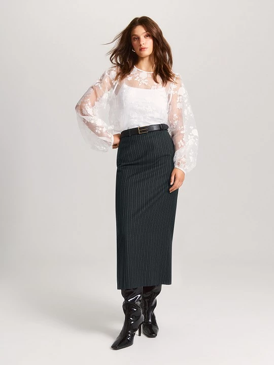 Легкая блуза с цветочным узором идеально отражает макротренд нового сезона, акцентируя внимание на прозрачности и легкости. Несмотря на свою кажущуюся хрупкость, блуза изготовлена из фактурной органзы, которая хорошо держит форму и обладает матовым блеском, придающим изделию элегантный вид. Одной из ключевых особенностей этой модели является легкий крэш-эффект, который меняет текстуру ткани и добавляет флоральному рисунку объем. Это создает интересный визуальный эффект, который привлекает внимание и делает блузу более выразительной. Наполненные втачные рукава, оформленные деликатной резинкой, придают модели завершенность и подчеркивают ее воздушность, создавая ощущение легкости и романтичности. Блуза дополнена внутренним топом с аккуратными тонкими бретелями, что обеспечивает дополнительный комфорт и уверенность при носке. Минимальный круглый вырез не отвлекает внимание от выразительного флорального рисунка и фиксируется сзади застежкой на пуговицу и воздушную петлю, что добавляет изюминку и делает модель более интересной. Материал, из которого выполнена блуза, представляет собой органзу высокого качества из волокон вискозы и полиэстера. Это сочетание обеспечивает воздухопроницаемость, повышает плотность и гладкость ткани, а также ее износостойкость. Топ в комплекте выполнен из тонкого трикотажа на основе вискозы, который приятно ощущается на коже и обеспечивает комфорт в течение всего дня. Таким образом, блуза из узорчатой органзы — это не просто элемент одежды, а стильное решение, которое позволяет создавать разнообразные актуальные образы. Она легко комбинируется с различными низами, от классических брюк до юбок, и прекрасно подходит для повседневных выходов и торжественных мероприятий.