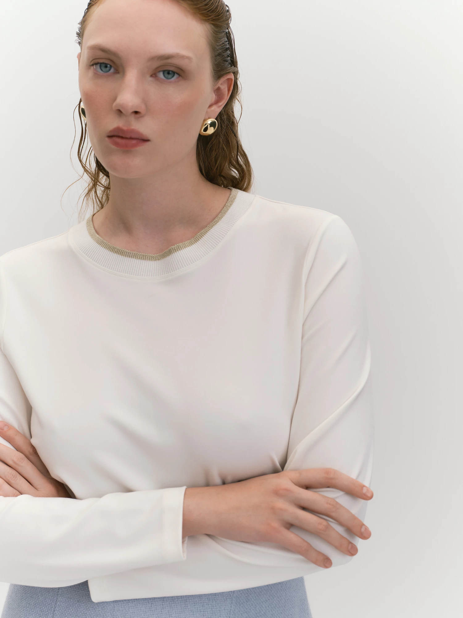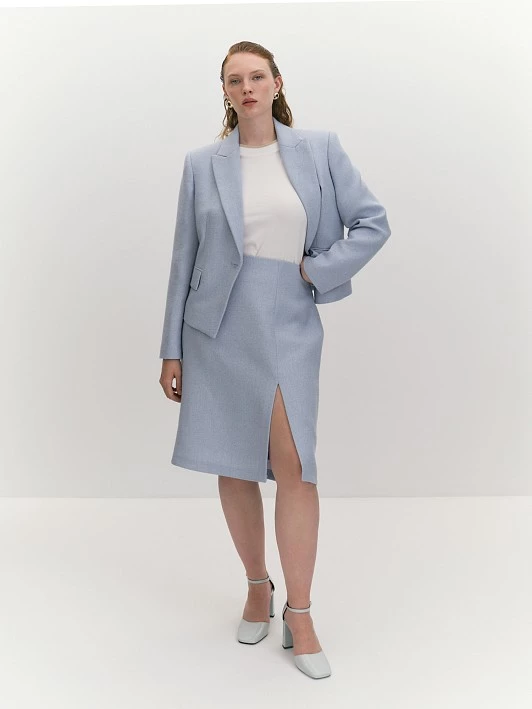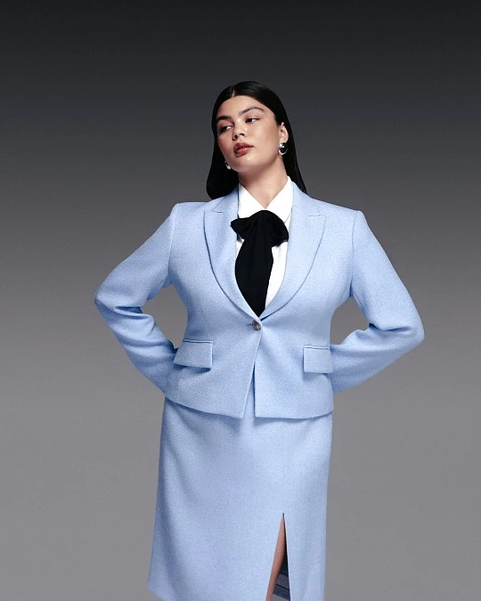 Благородный шерстяной твид с переплетением "донегал" подчеркивает премиальный характер модели. Выбрали для укороченного жакета подчеркивающий талию крой, он достигнут с помощью вертикальных вытачек, дизайнерского среза борта и застежки на одну гербовую пуговицу. Лацканы английского воротника выполнены особым образом - они слегка расширены и подняты к основной части детали, что создает широкие возможности для стилизации с помощью аксессуаров. Невысокий подплечник и втачной рукав формируют четкую линию плеча, а боковые карманы с клапанами и в рамку логично завершают модель. Небесно-голубой цвет (Selestial Blue) благороден, аристократичен и практически универсален в сочетаниях, жакет в таком оттенке составит эффектный образ не только с костюмной юбкой, но и с лонгсливом LS0004K и темно-синими брюками из плотного трикотажа TR0520K.