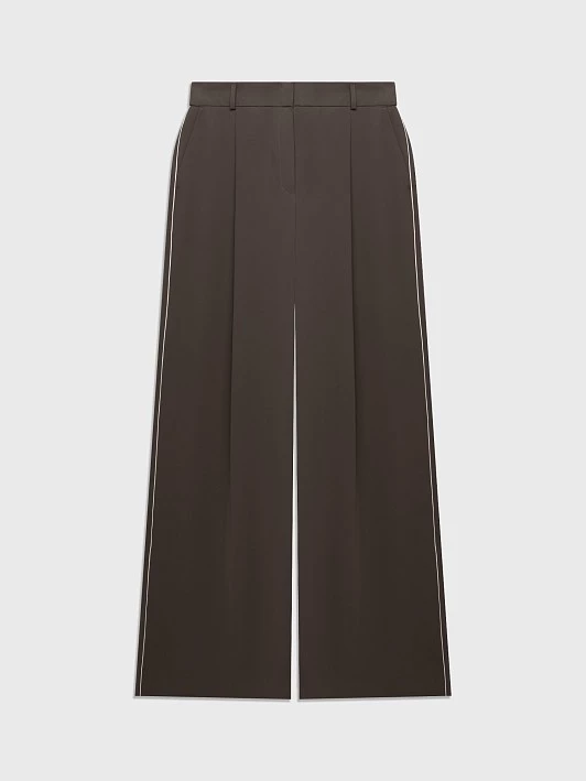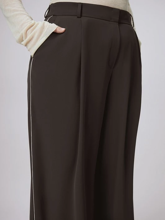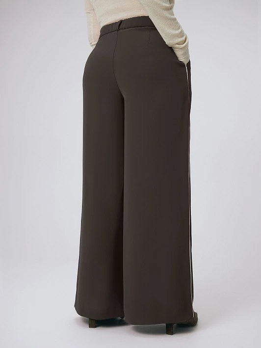 Прямые брюки в коричневом оттенке из трикотажного полотна с примесью полиэстра. Материал износостойкий и отлично держит форму. Пояс с резинкой по спинке обеспечивает идеальную посадку на любой тип фигуры, а строгий темный оттенок, косые карманы и застежка-гульфик придает этим брюкам более классический вид. Рекомендуется комбинировать с блузками и жакетом из коллекции для создания стильного офисного образа.