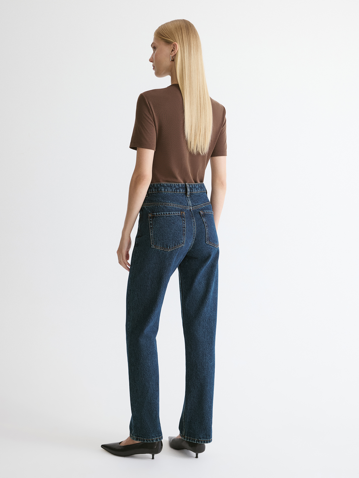 Классические прямые джинсы relaxed fit - одна из составляющих базового гардероба. Высокая удобная посадка, застежка на молнию и болт, пять традиционных карманов и плоская кокетка - идеальная модель для повседневной носки и офисного кэжуала.