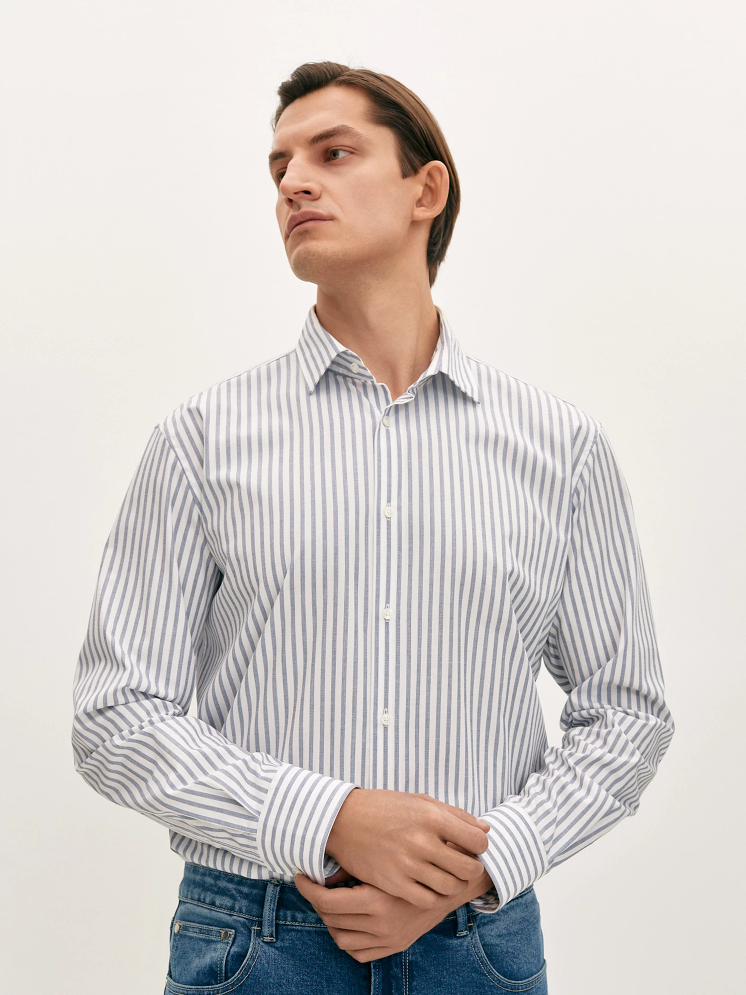 Рубашка в вертикальную полоску в бело-голубых оттенках в комфортном прямом силуэте, который подходит для любого типа фигуры и придает особую свободу движений в течение дня. Модель из натурального хлопка с отложным воротником, длинным рукавом с манжетами и центральной застёжкой на пуговицах. Рубашка с графичным дизайном станет альтернативой классической однотонной рубашке для создания делового образа и неформальных образов с джинсами.