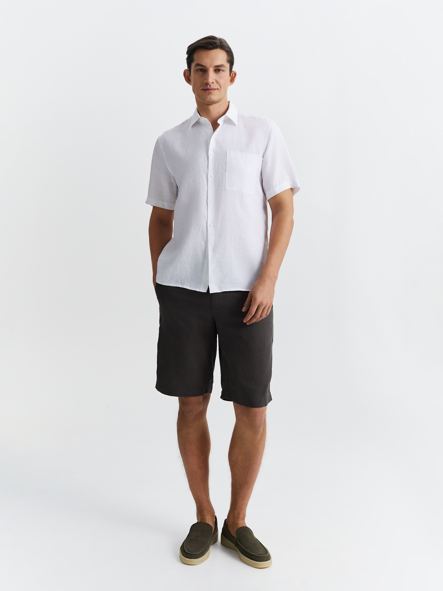 Белая рубашка прямого силуэта из премиальной льняной ткани обладает отличной терморегуляцией и воздухопроницаемостью. Модель с отложным воротником, коротким рукавом и накладным карманом на груди. Рубашка будет прекрасным дополнением к льняным шортам, джинсам или брюкам, создавая комфортный расслабленный летний образ.