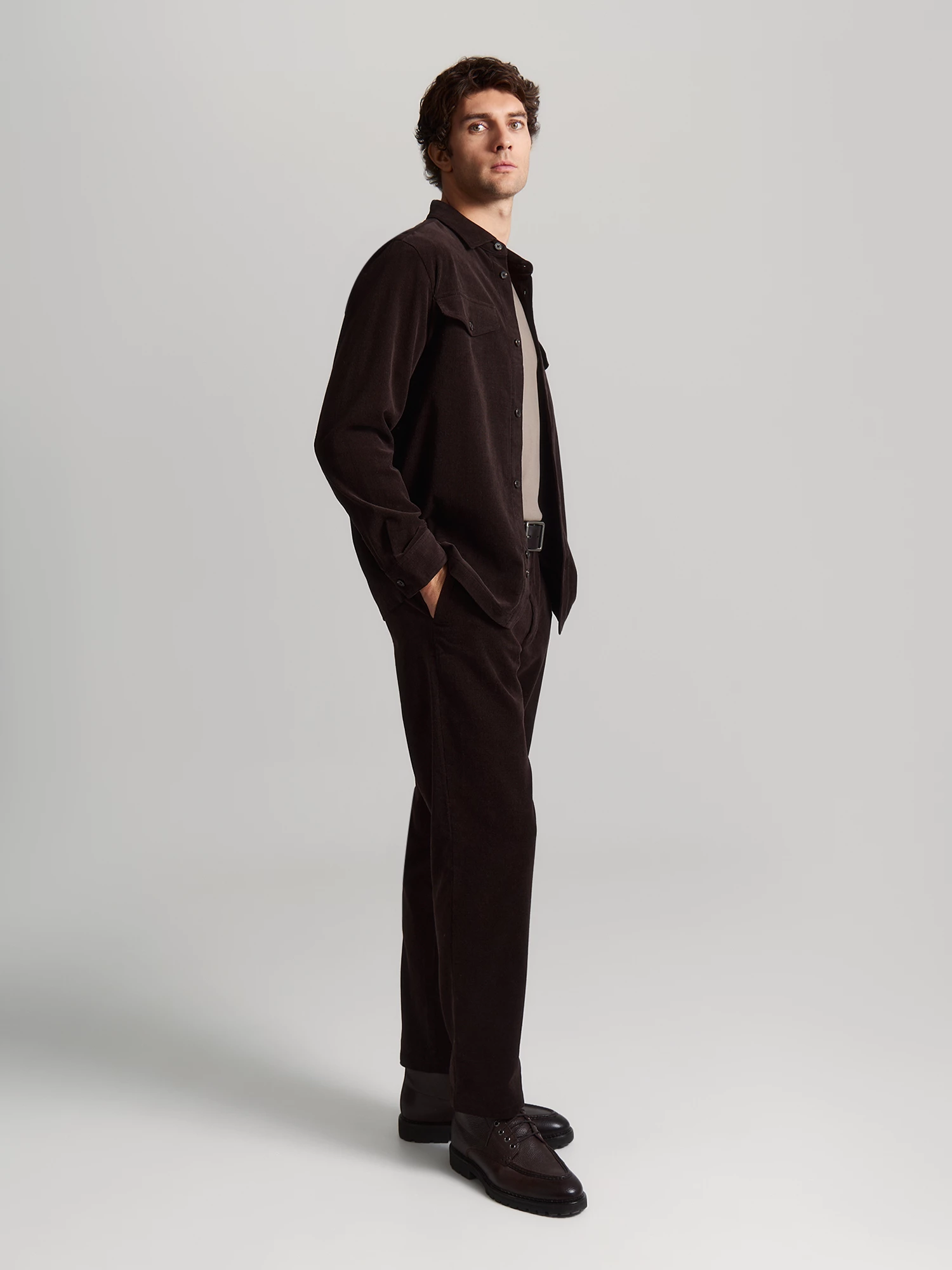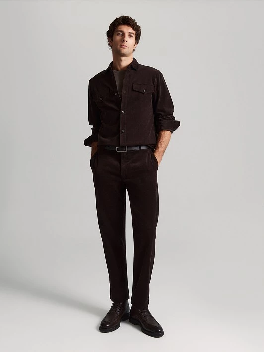 Вельветовую рубашку с длинным рукавом и застежкой на пуговицы изготовили из 100% натурального хлопка насыщенного шоколадного оттенка. Мягкий и приятный на ощупь материал комфортно сидит на фигуре и при правильном уходе сохраняет свою прочность и изначальный вид на протяжении многих сезонов. Прямой силуэт рубашки с отложным воротником позволяет носить ее вторым слоем поверх футболки или тонкой водолазки, создавая актуальные образы на каждый день.