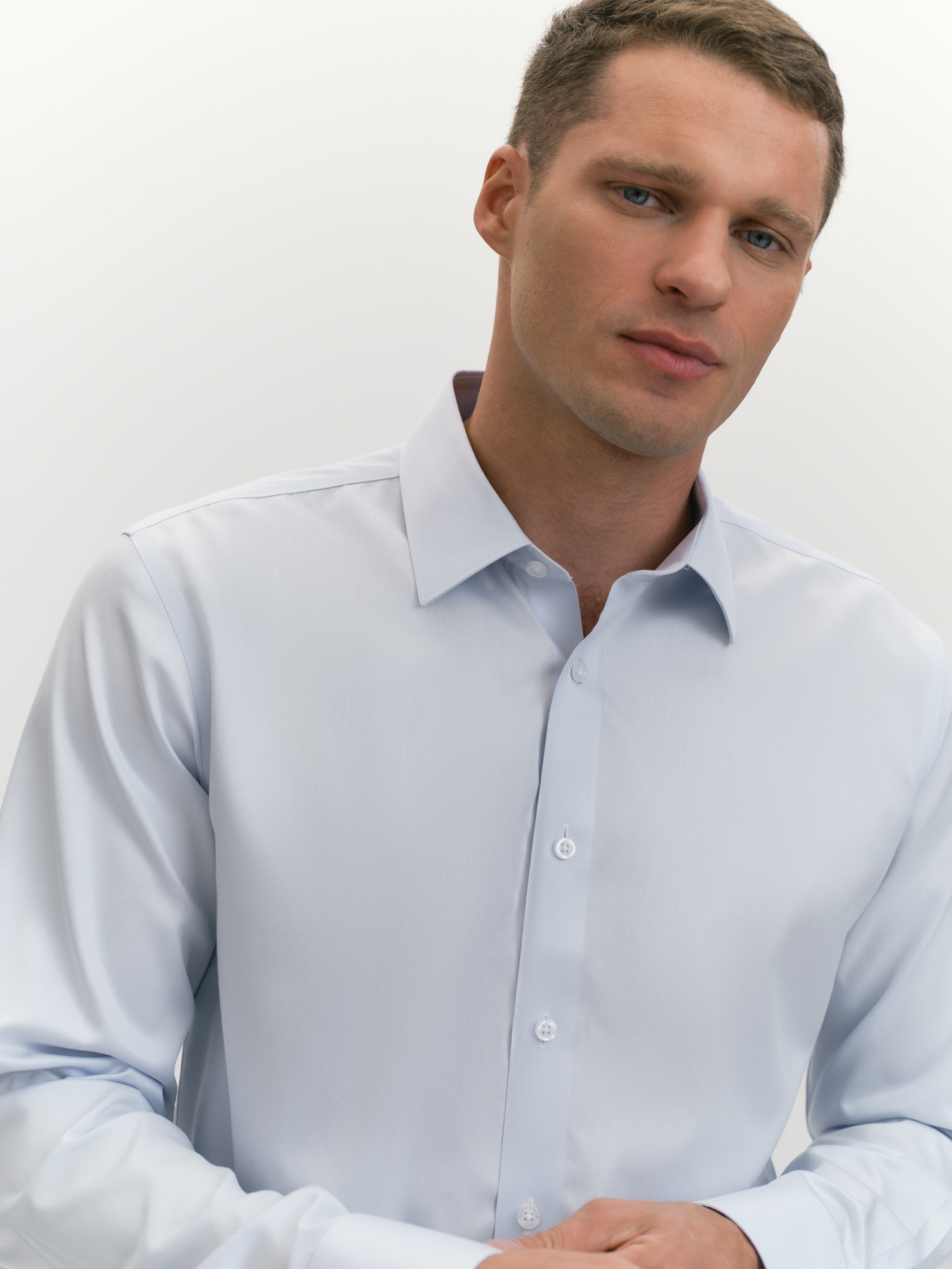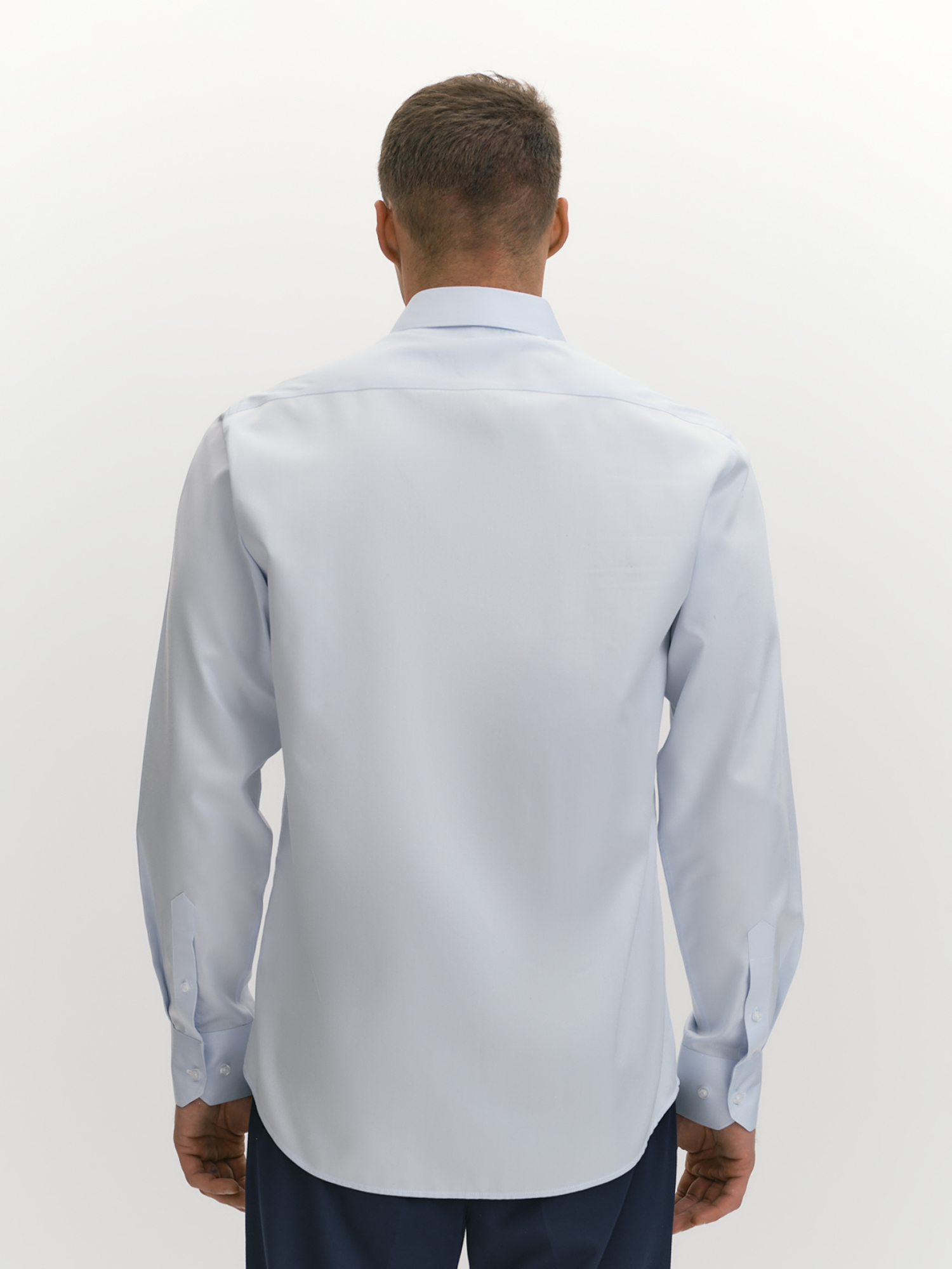 Технология non iron (или "не требует глажки") создана для занятых мужчин, ценящих практичность и стиль, она упрощает уход за рубашкой, сохраняя её опрятный вид даже после стирки. Non iron - это специальная обработка ткани, которая позволяет сохранить опрятный вид рубашки, минимизируя необходимость утюжки. Модель лаконичного дизайна сочетает строгость и современность. Отложной воротник на отрезной стойке и застежка на планку с пуговицами дисциплинируют, а узкая кокетка на спине и закругленный низ придают современный акцент, подчеркивая внимание к деталям. Рубашка выполнена из хлопка, который обеспечивает высокий уровень комфорта, гипоаллергенность и воздухопроницаемость, делая её приятной для ношения в течение всего дня. Голубой цвет создает свежий и стильный образ, подходящий для офиса и повседневной носки. Он легко комбинируется с другими элементами гардероба. Крой рубашки с силуэтом regular обеспечивает комфортную посадку, не стесняя движений. Отложной воротник на косточках сохраняет форму и добавляет рубашке элегантности, а длинный втачной рукав с манжетом позволяет регулировать длину, создавая аккуратный вид. Узкая кокетка на спине улучшает посадку, а закругленный низ добавляет удобство при ношении навыпуск. Такая рубашка подчеркнет стиль и добавит образу элегантности в любой ситуации.