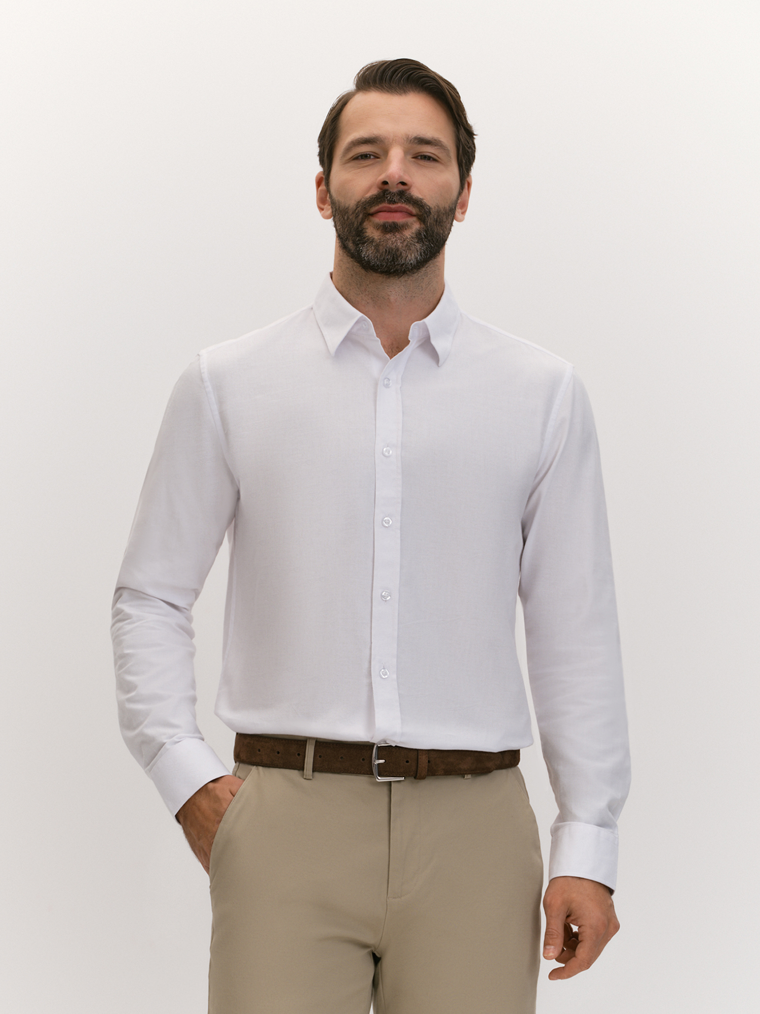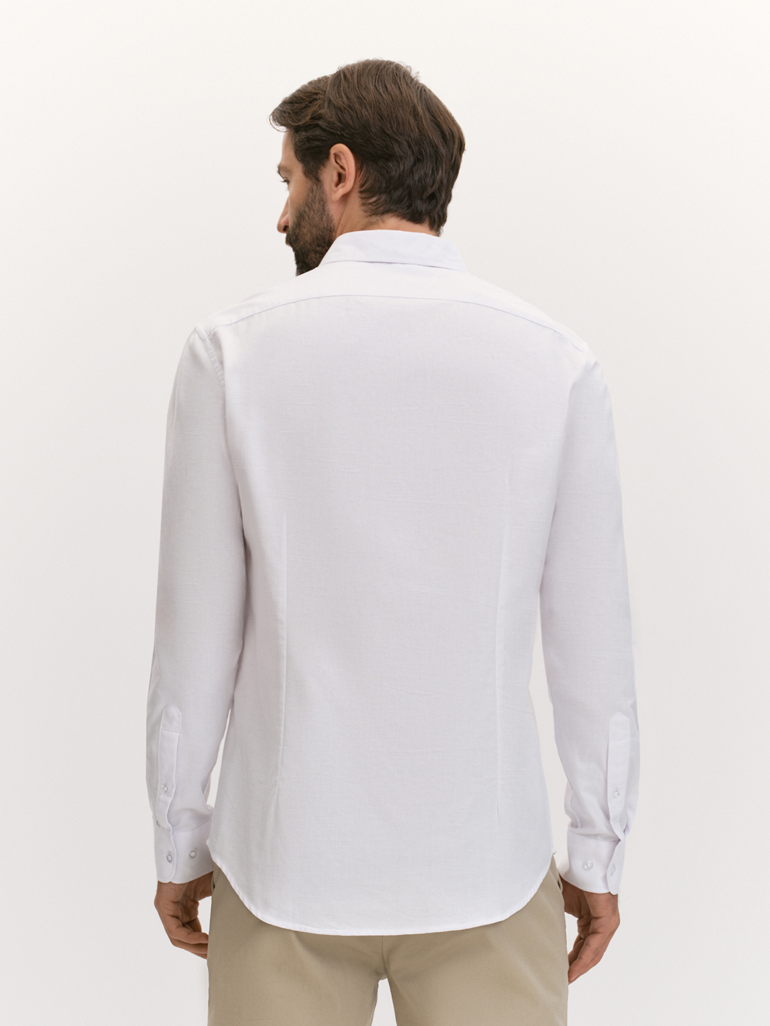 Oxford - прочная и практичная ткань, преимущества которой обусловлены особым плетением и составом. При переплетении волокон полотно оксфорд получается состоящим из рельефных квадратов в шахматном порядке. Такая ткань хорошо дышит, устойчива к механическим повреждениям и истиранию. Модель лаконичного дизайна сочетает строгость и современность. Отложной воротник на отрезной стойке и застежка на планку с пуговицами дисциплинируют, а узкая кокетка на спине и закругленный низ придают современный акцент, подчеркивая внимание к деталям. Белый цвет подчеркивает элегантность и статусность, легко сочетаясь с любым стилем одежды. Он освежает образ и легко комбинируется с другими элементами гардероба. Силуэт slim обеспечивает комфортное облегание, подчеркивая фигуру. Такой эффект стал возможен благодаря выверенным вертикальным вытачкам на спине. Отложной воротник добавляет рубашке элегантности, а длинный втачной рукав с манжетом позволяет регулировать длину, создавая аккуратный вид. Узкая кокетка на спине улучшает посадку, а закругленный низ добавляет удобство при ношении навыпуск. Такая рубашка подчеркнет стиль и добавит образу элегантности в любой ситуации.