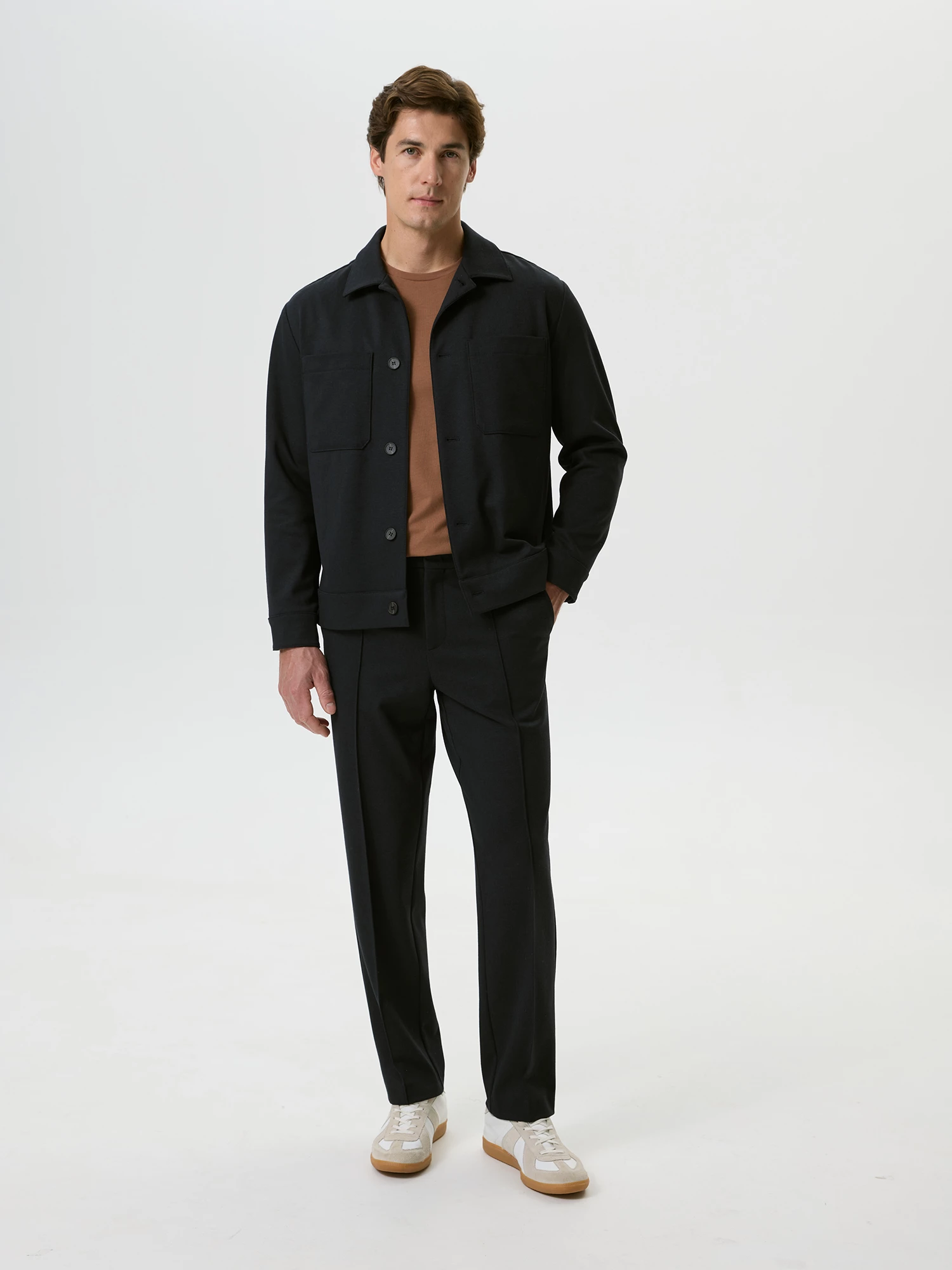 Стильный шакет — куртка-рубашка, которая станет незаменимым элементом гардероба. Модель с отложным воротником и застежкой на пуговицы сочетает в себе элементы классического стиля и современного дизайна, что делает ее идеальным выбором для мужчин, стремящихся к элегантности и комфорту. Шакет выполнен из высококачественной сине-черной меланжевой трикотажной ткани, в состав которой входят вискоза, шерсть, поливолокна и спандекс. Это сочетание материалов обеспечивает отличную воздухопроницаемость и комфорт при носке, а небольшой, тактильно приятный ворс с изнаночной стороны добавляет уют и тепло в прохладные дни. Длинные втачные рукава с манжетами на пуговице придают модели аккуратный и стильный вид, а нагрудные накладные карманы со срезами подчеркивают рубашечный стиль и добавляют функциональности. Планка по низу изделия способствует формированию комфортного напуска, что позволяет легко комбинировать шакет с различными предметами гардероба. Эта куртка-рубашка отлично подойдет как для повседневной носки, так и для более формальных мероприятий. Вы можете сочетать ее с классическими брюками или джинсами, создавая стильные образы для работы или отдыха. Шакет станет универсальным элементом Вашего гардероба, который легко адаптируется к различным стилям и ситуациям. Выбирая этот шакет, вы получаете не только модный, но и практичный предмет одежды, который будет радовать вас своим внешним видом и комфортом на протяжении долгого времени. Это идеальный выбор для мужчин, ценящих стиль и качество в каждой детали.