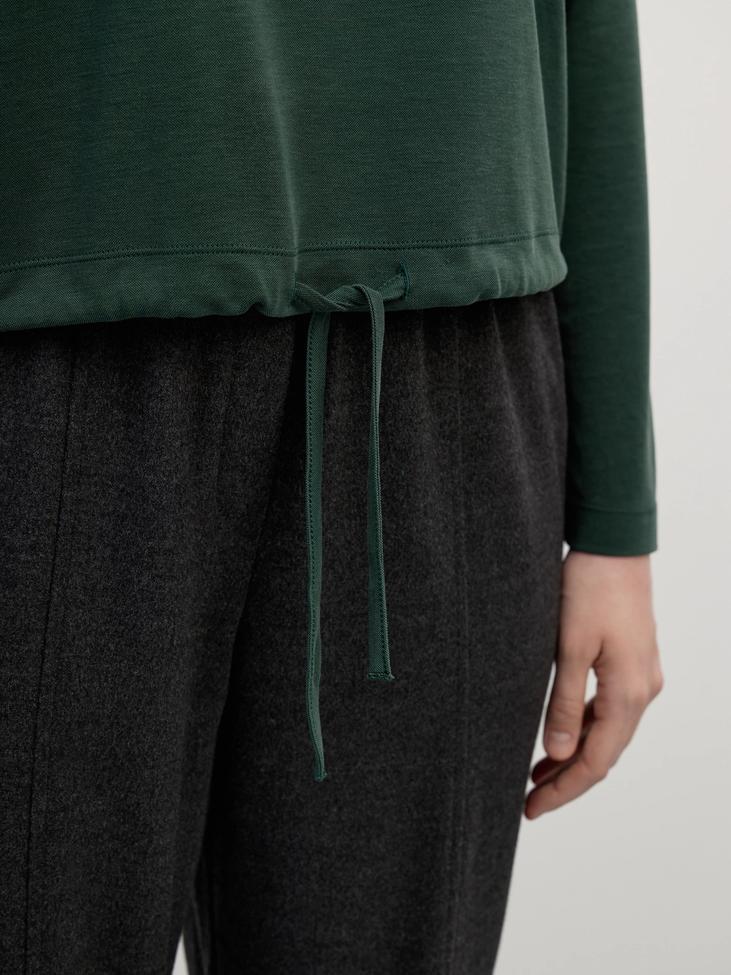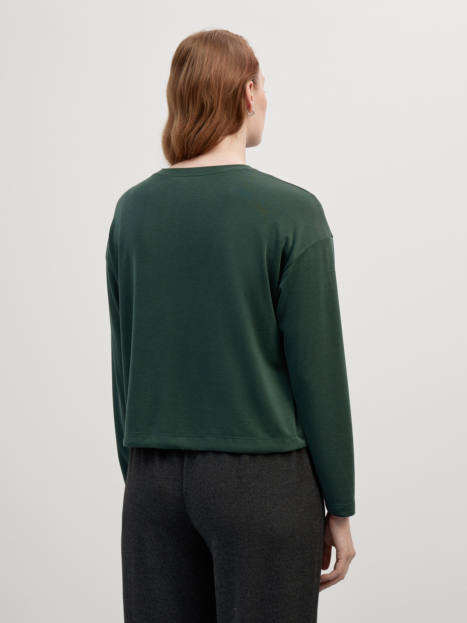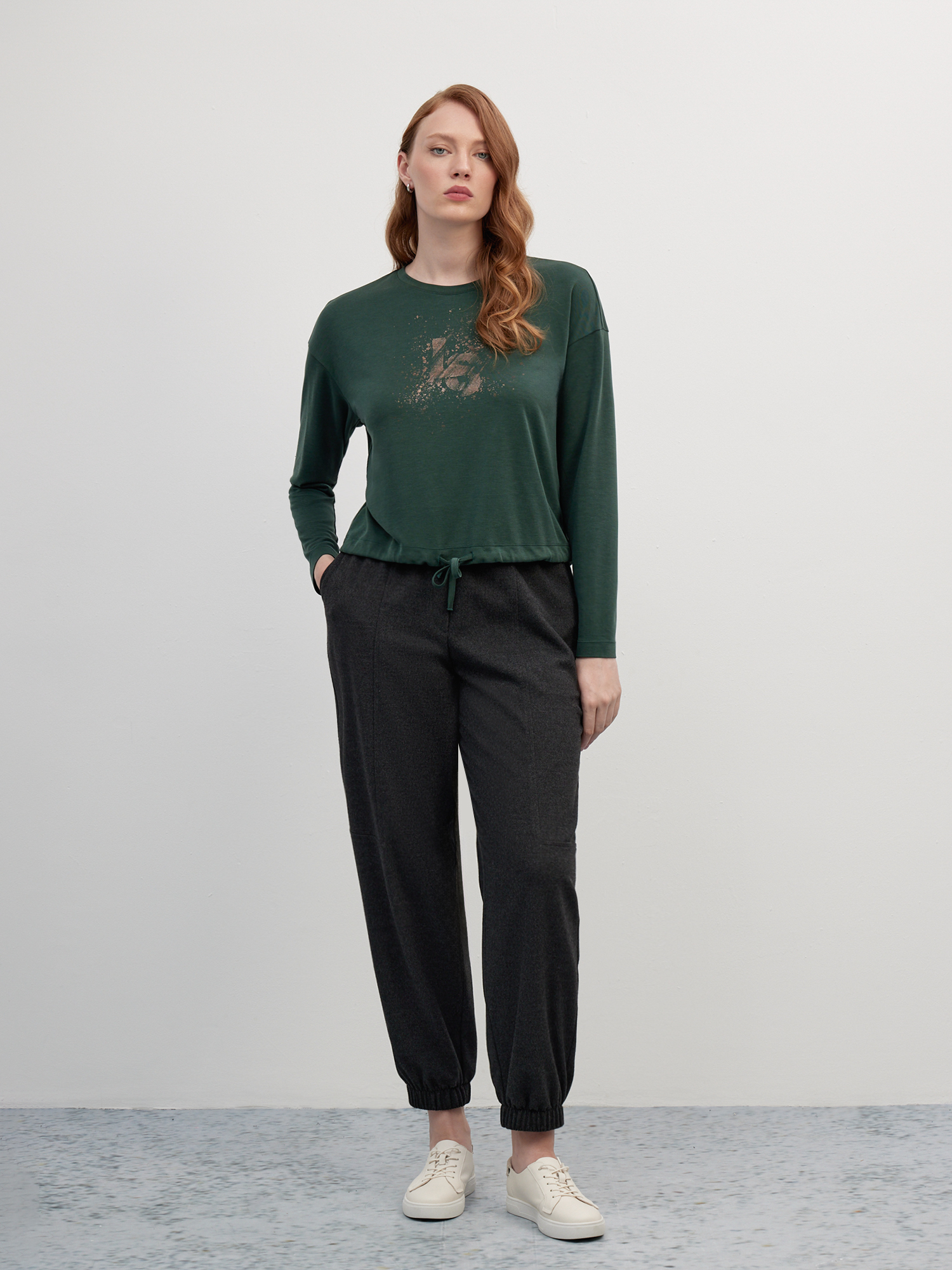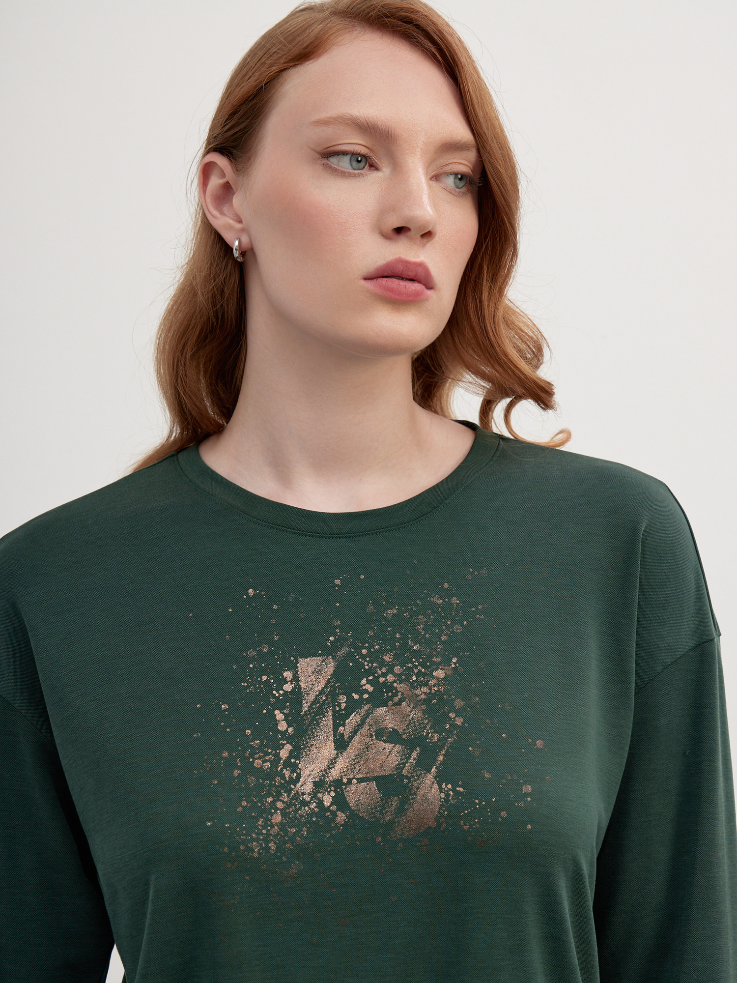 Стильная блуза в темно-зеленом оттенке с акцентной деталью - фольгированным принтом монограммы бренда. Свободный силуэт, спущенная линия плеча, округлая горловина и кулиска по низу со шнурком создают мягкий комфортный силуэт, который идеально впишется как в спортивный, так и в повседневный комплект в сочетании с джоггерами и кроссовками. Гладкий трикотаж на основе модала - современного вискозного волокна, в меру плотный и отлично тянется, не ограничивая свободу движений.