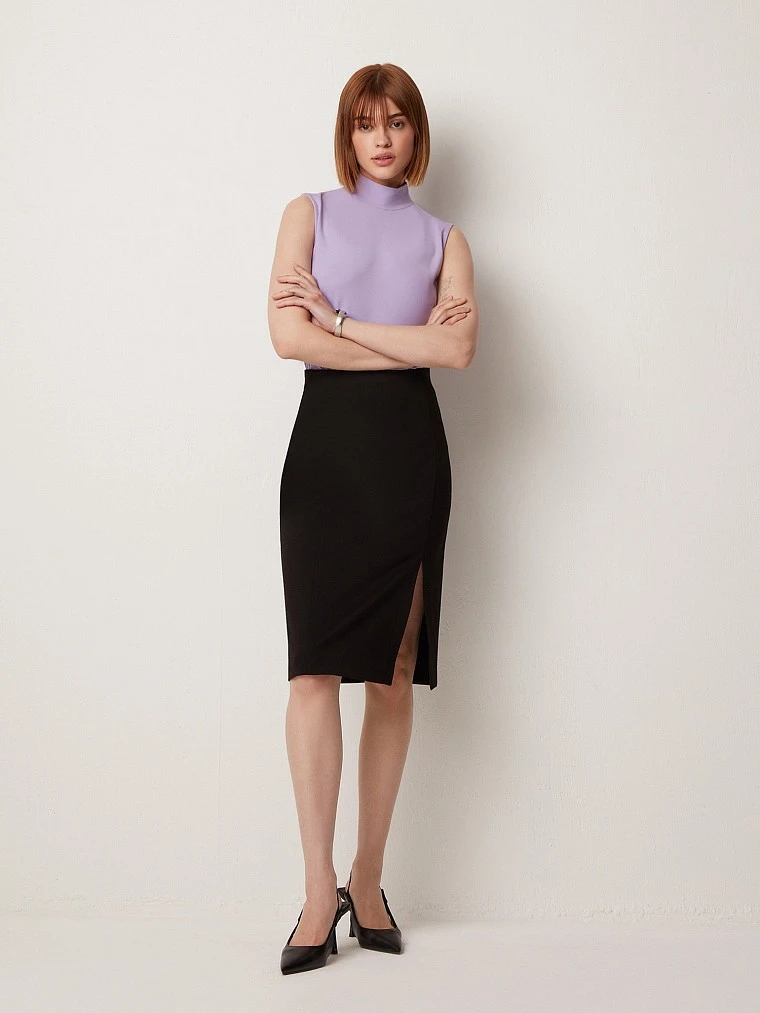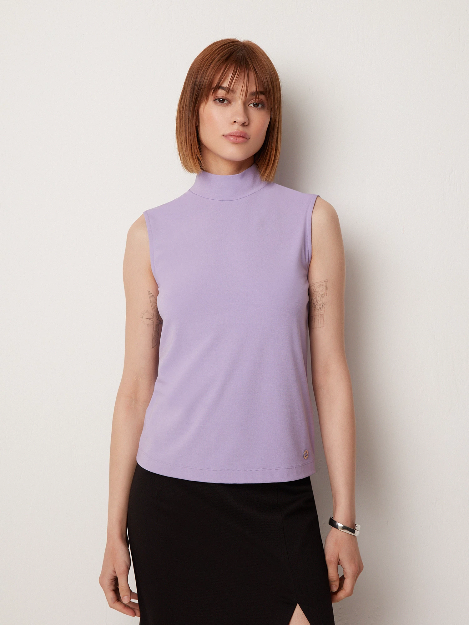 Стильный базовый топ лавандового оттенка выполнен из эластичного трикожажа на основе вискозы. Модель удобного полуприлегающего силуэта с комфортным воротником-стойкой и потайной застёжкой на тесьму-молнию сзади. Топ без рукавов, с американской проймой, оптимальной длины. Фирменный стиль - дизайнерская металлическая эмблема. Универсальная модель дополнит как деловой образ, так и лук в стиле смарт-кэжуал.