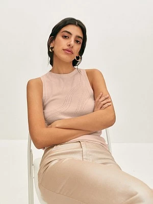 Топ с круглой горловиной выполнили из мягкой итальянской пряжи, которая комфортно ощущается на теле. Акцентом изделия стал вывязанный рисунок по центру в виде плавных линий. Такая модель с резинкой по пройме и горловине разбавит базовый образ и отлично будет смотреться с джинсами и брюками.