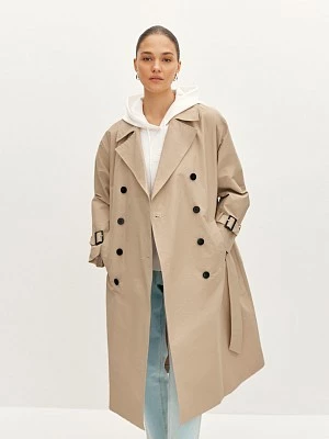 Классический тренч бежевого оттенка с поясом. Плотный хлопковый материал со специальной пропиткой не боится моросящего дождя и защитит от легкого ветра. Модель прямого силуэта с широким отложным воротником с лацканами, карманами с листочкой и двубортной застёжкой на чёрные пуговицы. Длинные втачные рукава декорированы патами с пряжками, линию талии можно подчеркнуть поясом из основного материала. Лаконичный тренч дополнит как классический образ, так и лук в стиле smart casual.
