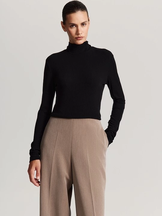 Водолазка в лаконичном черном цвете станет обязательным элементом гардероба — она легко сочетается с джинсами, брюками и юбками, подходя для повседневной носки или офиса.