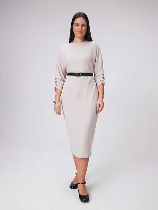 Не каждая модель подчеркивает и одновременно моделирует фигуру, все дело в выверенном крое платья из супер-эластичного трикотажа. Модель длины миди выполнена с аккуратным круглым вырезом и застежкой сзади на потайную молнию. Вертикальные рельефы вытягивают силуэт, а горизонтальные подрезы подчеркивают талию. Такие горизонтальные линии кроя, вместе с цельнокроеным рукавом, способствуют формированию силуэта "песочные часы". Сборка по низу рукава придает модели воздушность и добавляет нотку романтики сдержанной модели. Платье дополнено разрезом сзади для комфортного шага. Эластичный вискозный трикотаж формоустойчив, долговечен, воздухопроницаем и тактильно приятен. Светло-бежевый цвет с пудровым оттенком будет хорошо сочетаться с базовыми и пастельными цветами. Особенно романтичный образ получится с пальто PD0065 из премиальной шерстяной ткани.