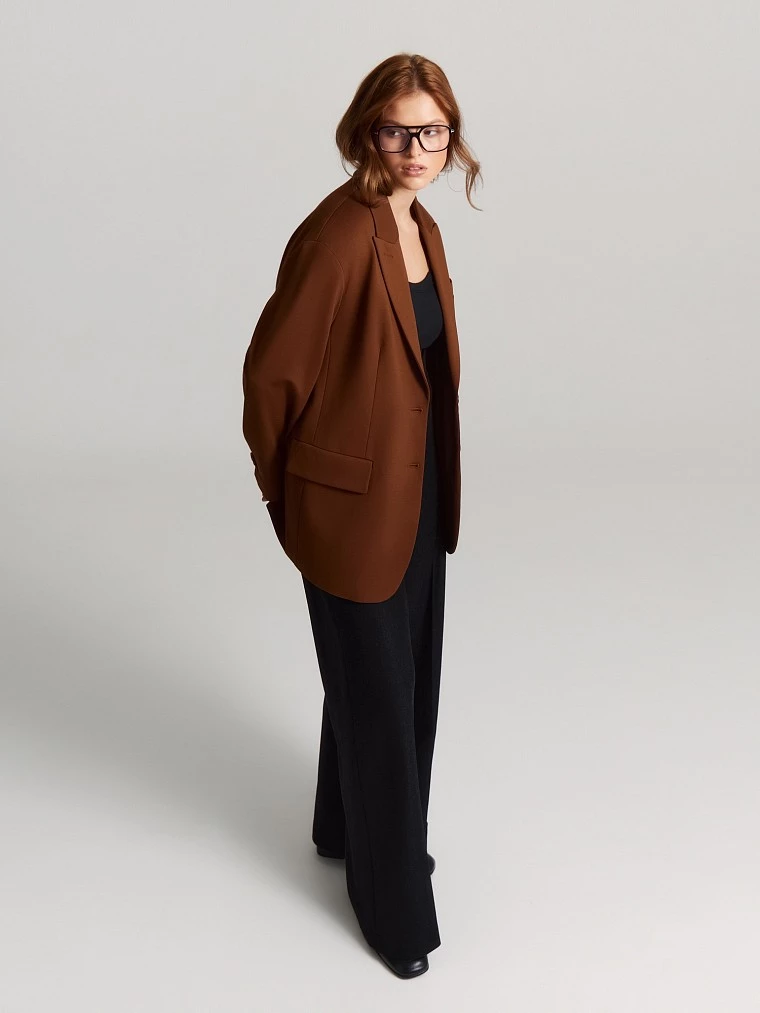 Брюки прямого кроя сшиты из эластичного трикотажа хорошей плотности с диагональным переплетением нитей. Основное вискозное волокно такой ткани - мягкое, тактильно приятное, с шелковистым блеском и хорошей воздухопроницаемостью.