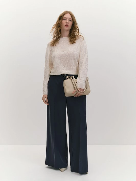 Оригинальный джемпер с дизайнерским переплетением нитей, демонстрирующим эффект "битого стекла", выполнен на современной японской плосковязальной машине Shima Seiki. Модель цельновязаная - это значит, что она не имеет швов и будет хорошо держать форму. Для джемпера прямого силуэта с вырезом-лодочкой выбрали особую пряжу с прочной шерстью мериноса и ценным кашемиром. Трендовый тонкий вязаный трикотаж в актуальном сливочном оттенке составит выразительный контрастный образ с палаццо из костюмной ткани TR0517.